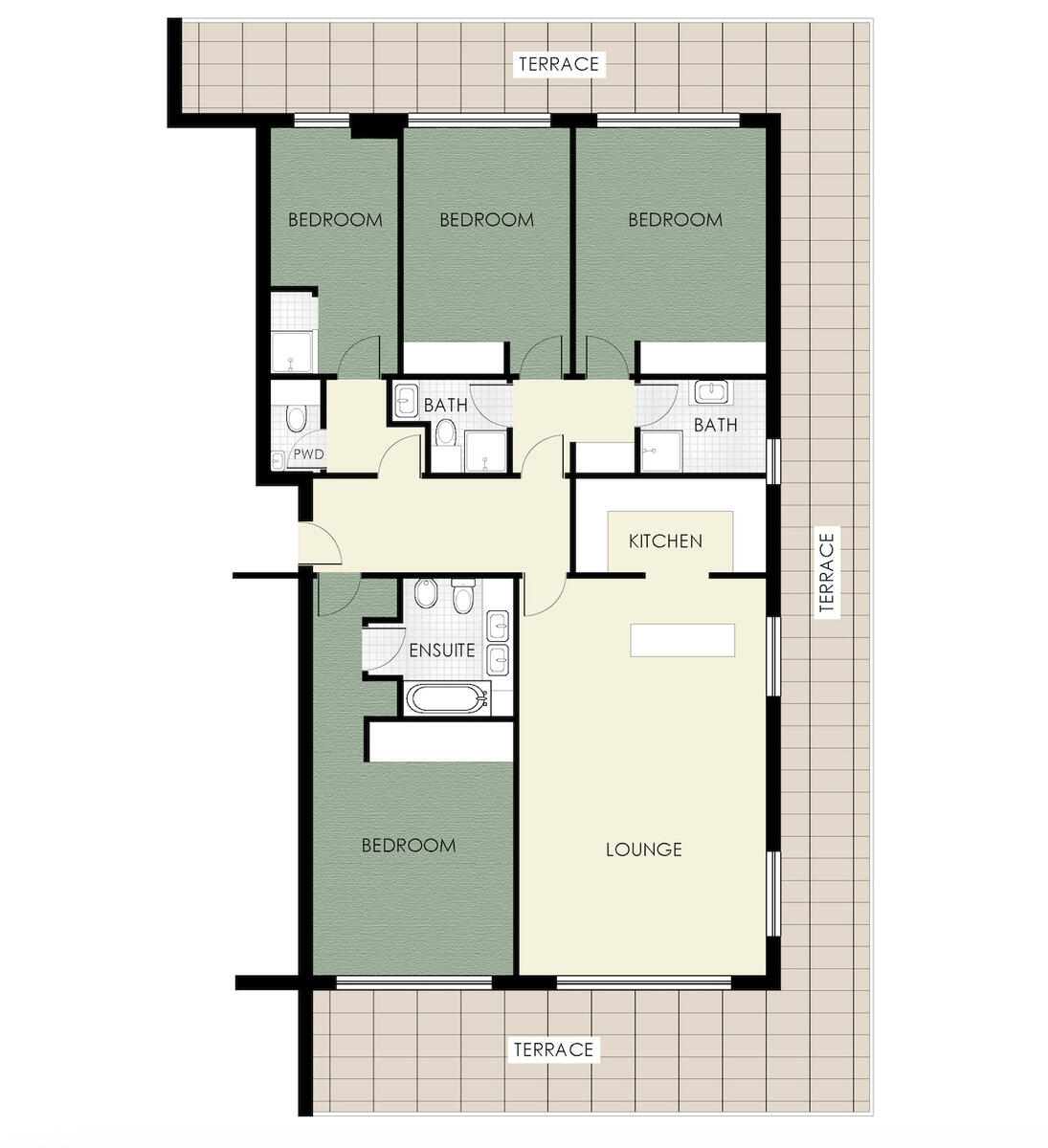 The apartment opens with a spacious marble-floored hallway leading to a bright open-plan living and dining area with access to a stunning wraparound terrace. The modern kitchen is fully equipped and features an island for informal dining.
