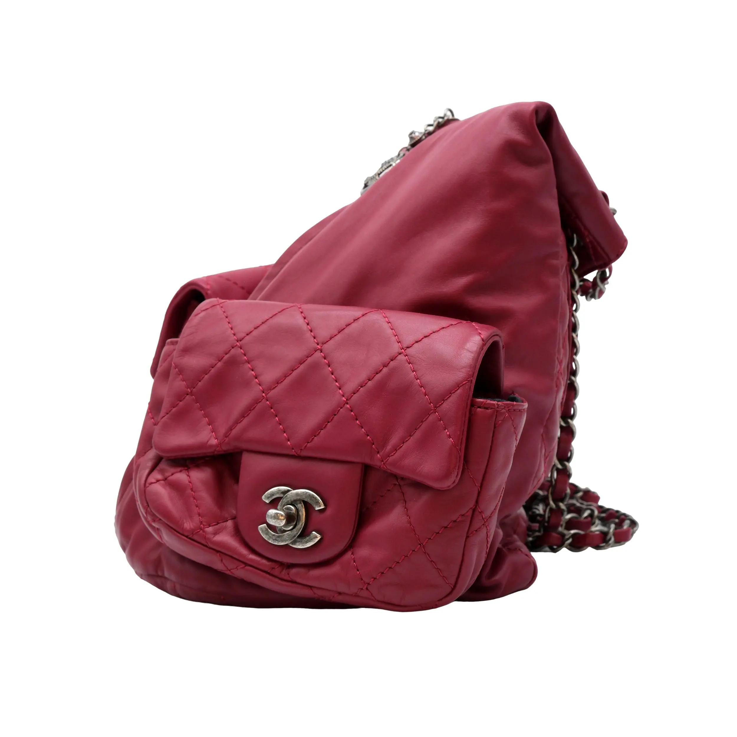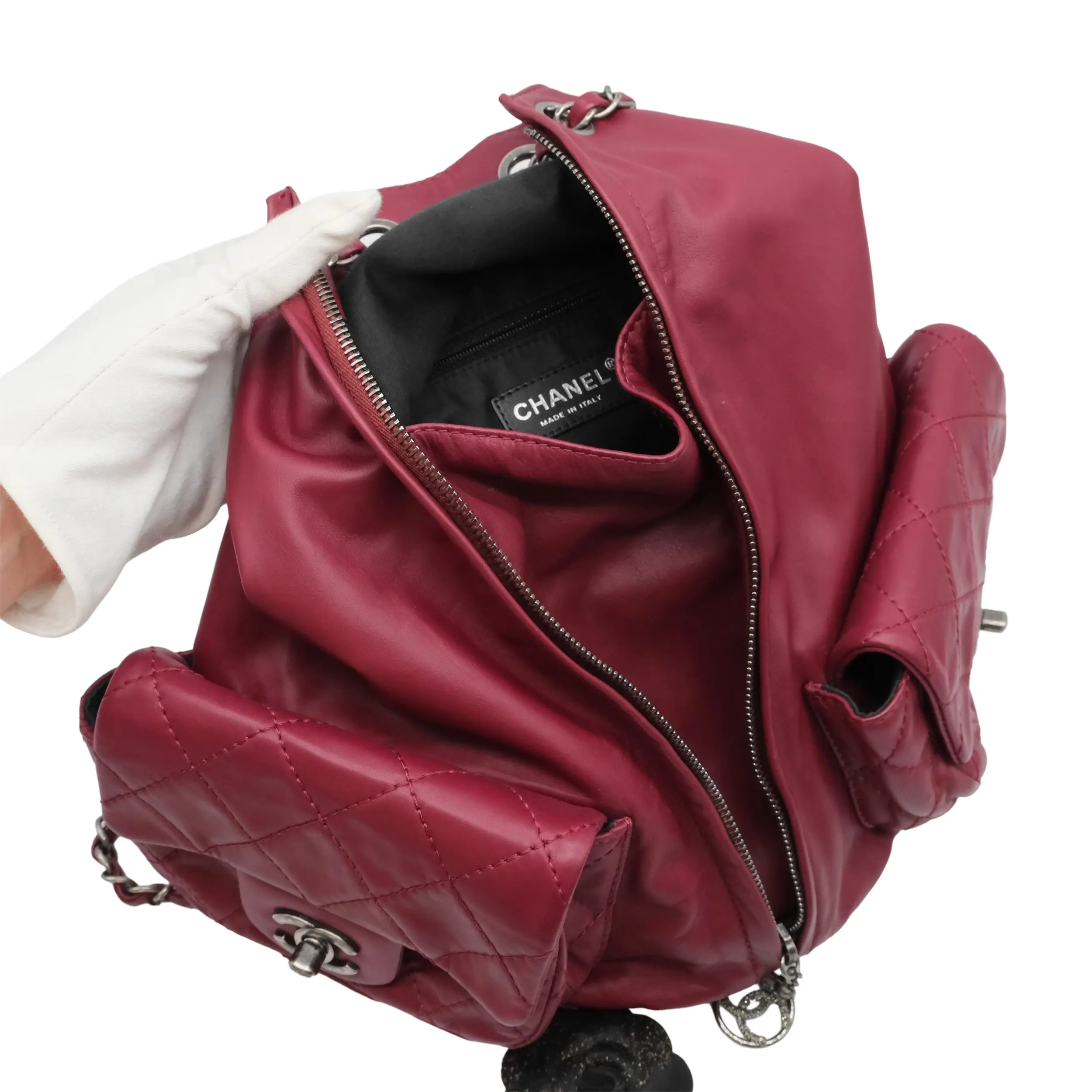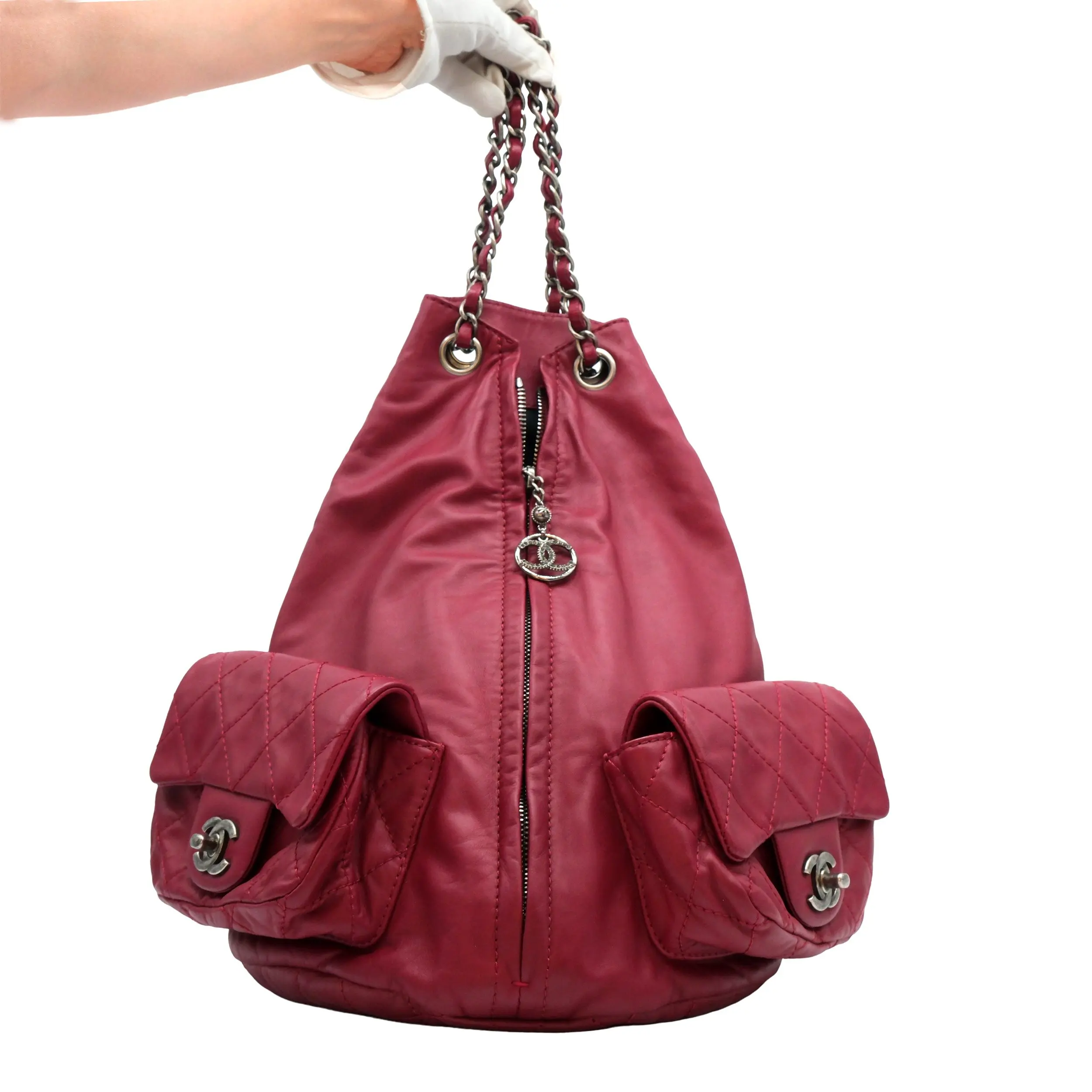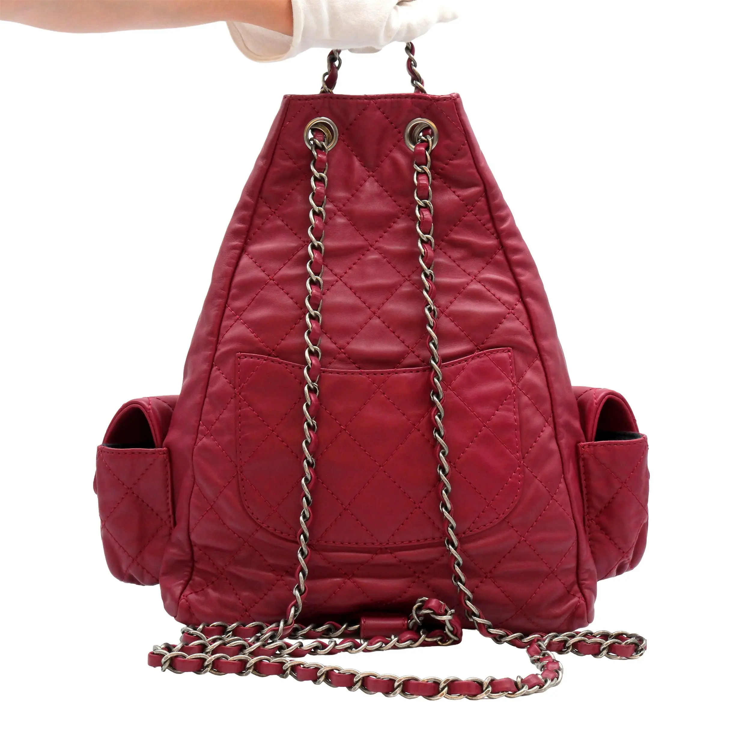 A rare and timeless Chanel quilted drawstring backpack in elegant red wine color. Designed with double front pockets and silver-tone hardware, it combines sophistication with practicality.