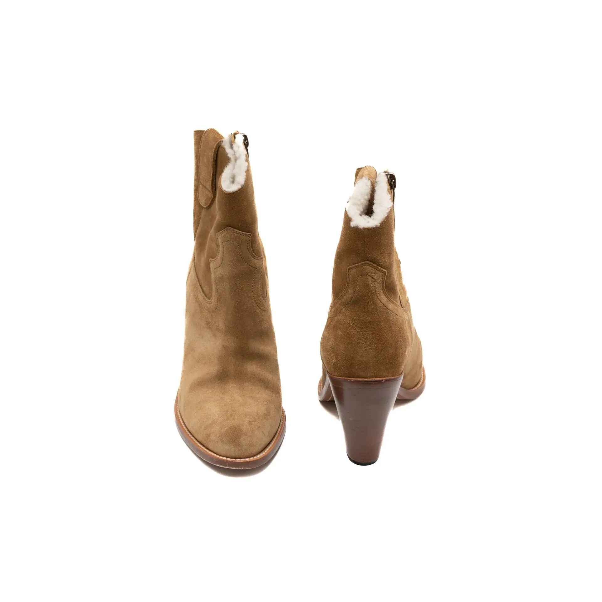 Chic Saint Laurent ankle boots in rich brown suede, lined with soft beige fur for both comfort and style. Featuring a 9 cm heel sole, they bring effortless elegance to winter looks.