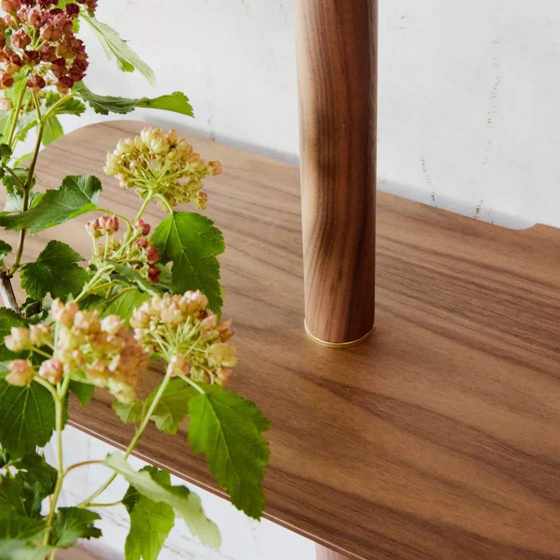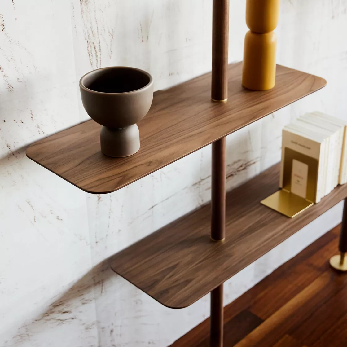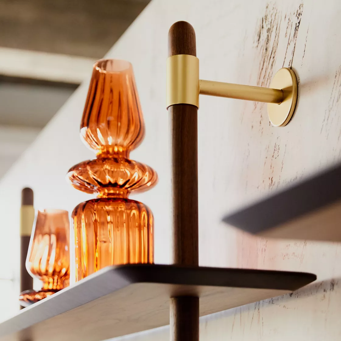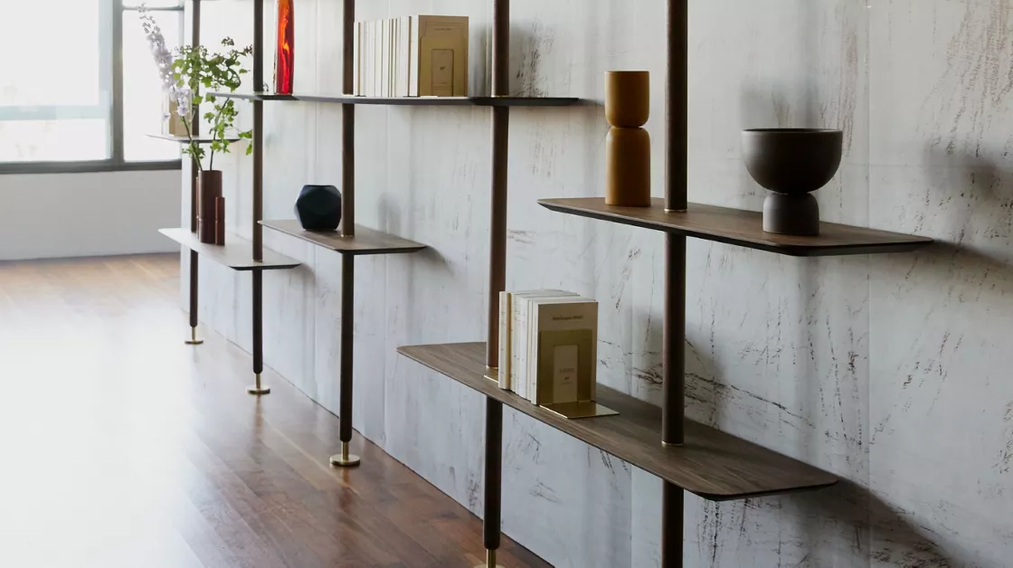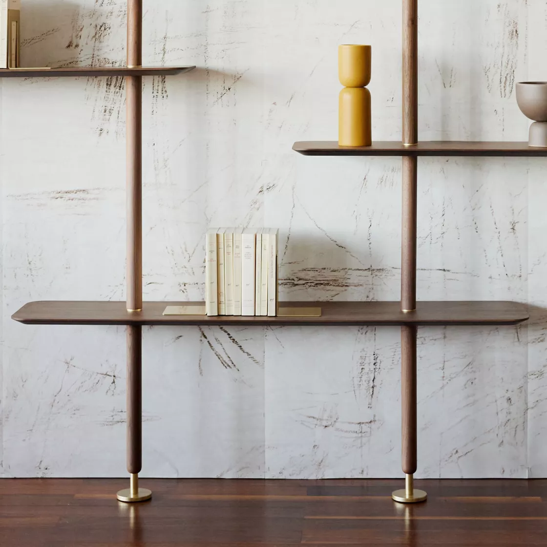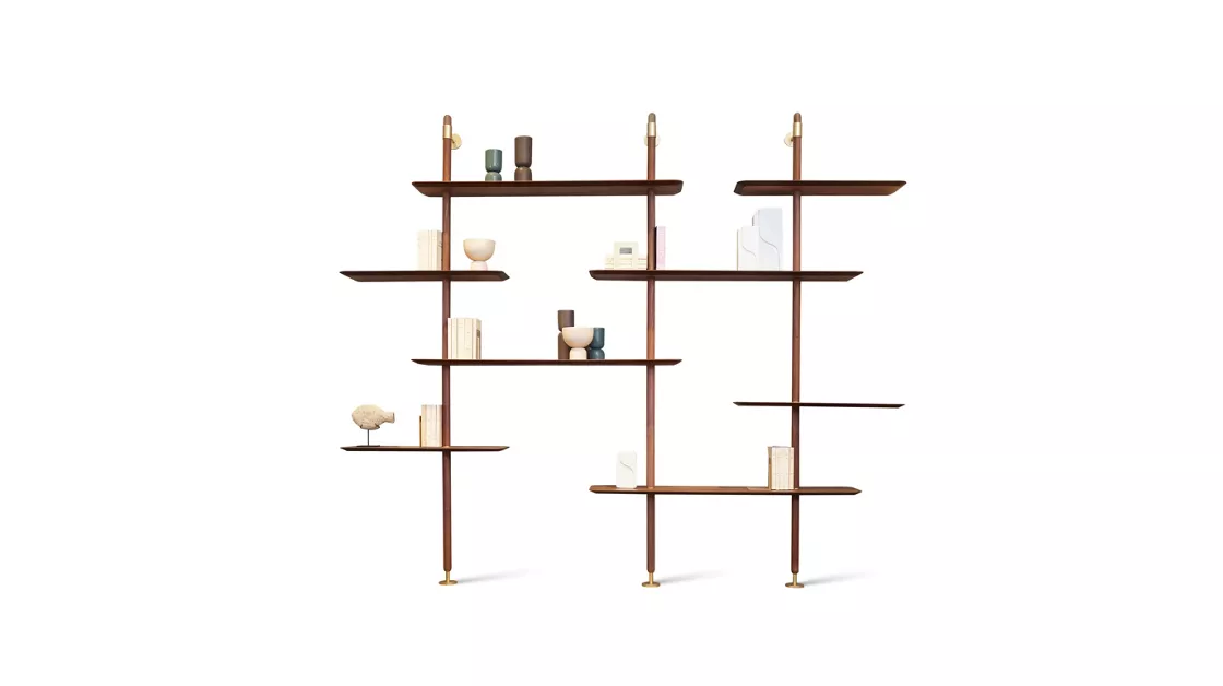 The Ketch Library is an all-wood wall-mounted shelving system, distinguished by its elegant details, finesse, and lightness. Its modular design allows you to create a customized wall display that is as functional as it is refined, complete with coordinated bookends for a seamless finish.