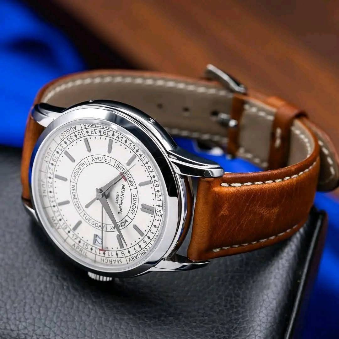 This timepiece blends modern mechanics with timeless design. The brown calfskin strap and polished steel case provide understated refinement suited for collectors and connoisseurs alike.