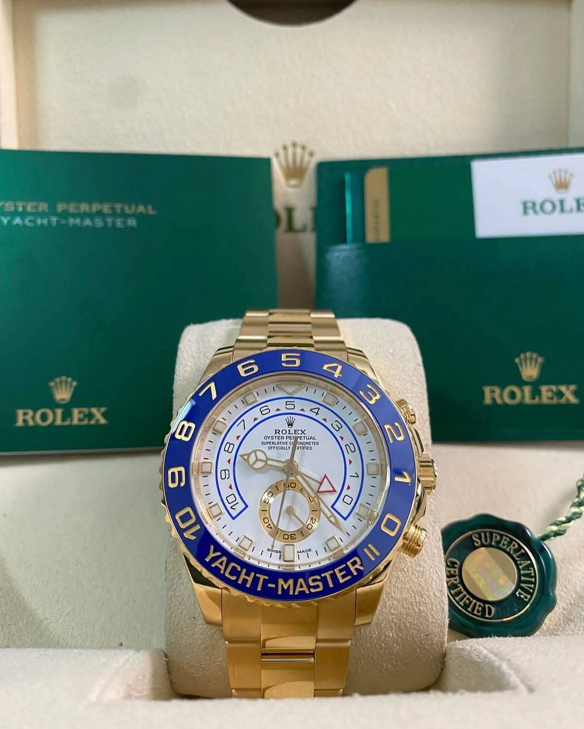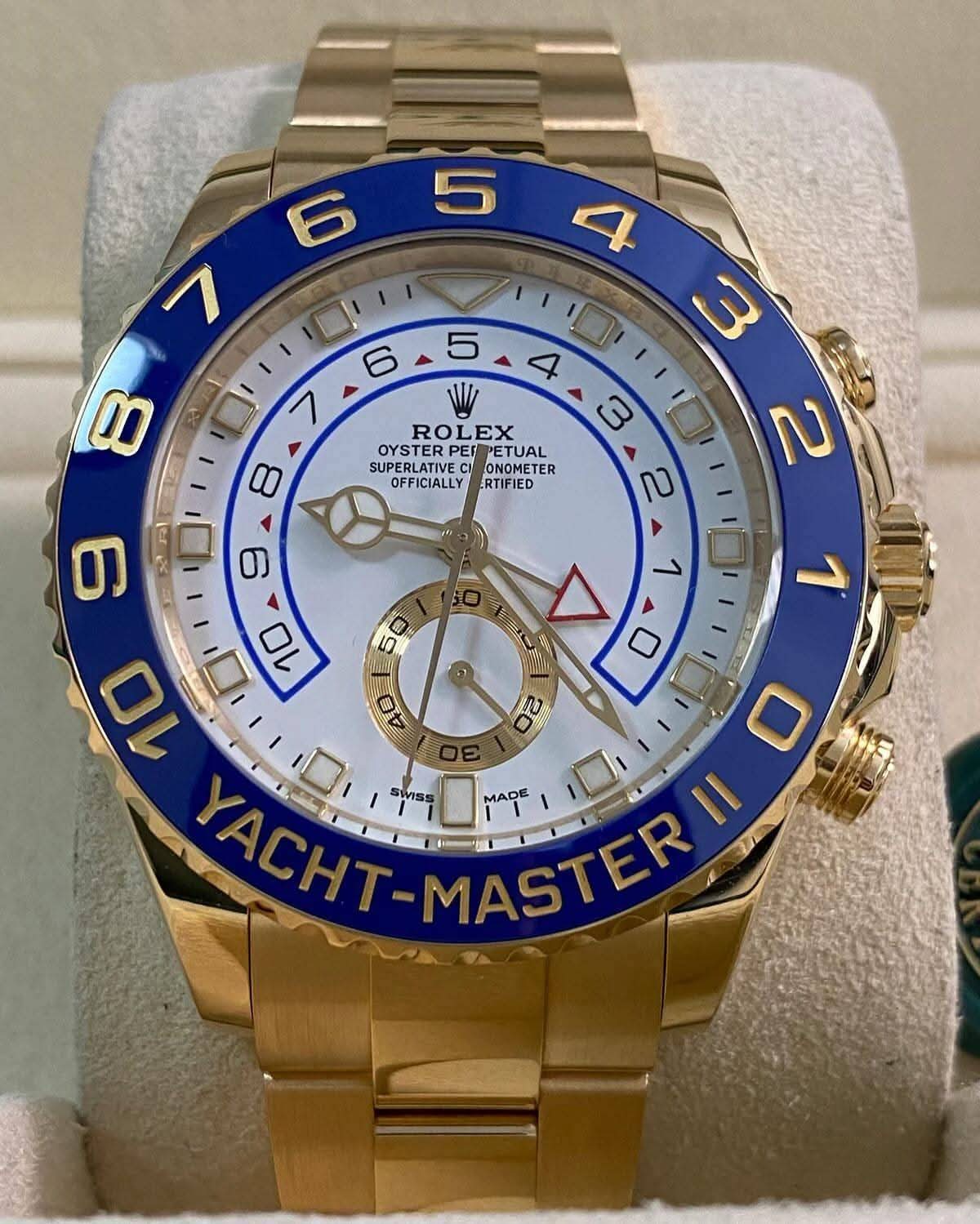 Rolex Yacht-Master II 116688 in gold with a 44mm case, white dial, and blue ceramic bezel.