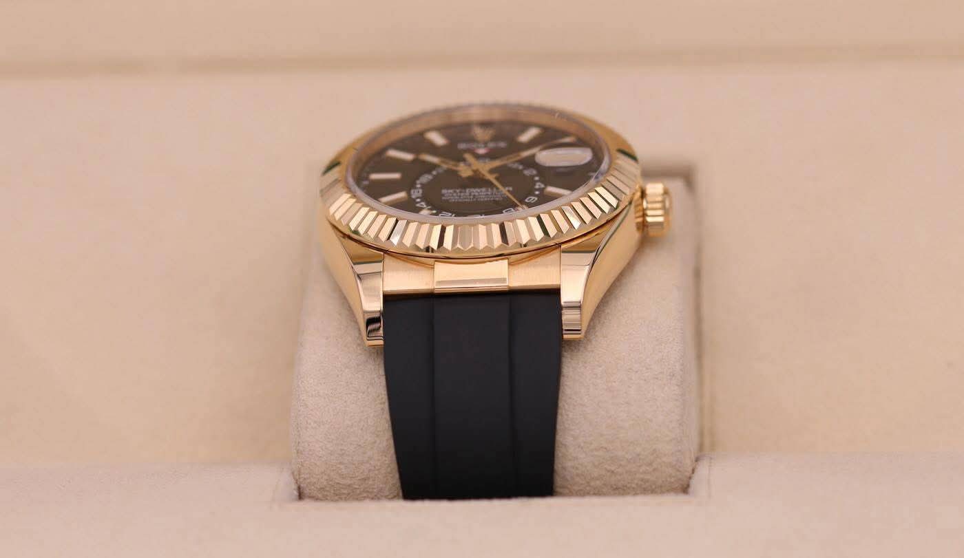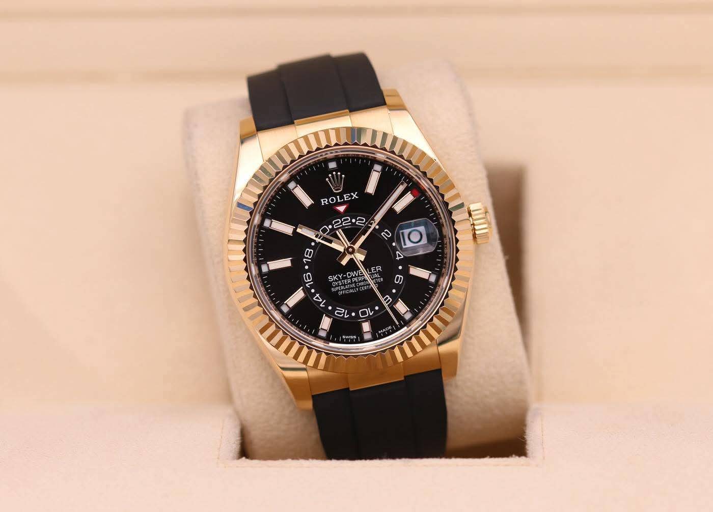 This Rolex Sky-Dweller is in excellent condition. This is the now discontinued reference featuring a black dial. The watch comes with the boxes, booklet, warranty card, green hang tag and was just sold in February of 2023.