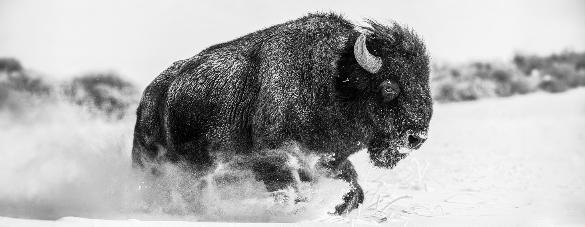 A breathtaking black-and-white fine art photograph capturing the raw power and grace of a bison charging through the snow. The dynamic movement and striking contrast evoke the spirit of wilderness and resilience — a masterpiece that commands attention in any interior.