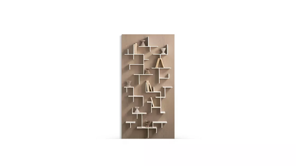 A masterpiece of graphic design and architectural balance, the Maze Library by René Bouchara turns storage into sculpture. With its maze-like geometry and minimalist construction, this wall-mounted bookcase combines precision, rhythm, and lightness. The contrast between oak wood and PMMA shelving gives it a unique visual depth — a statement piece that transforms any wall into a work of art.