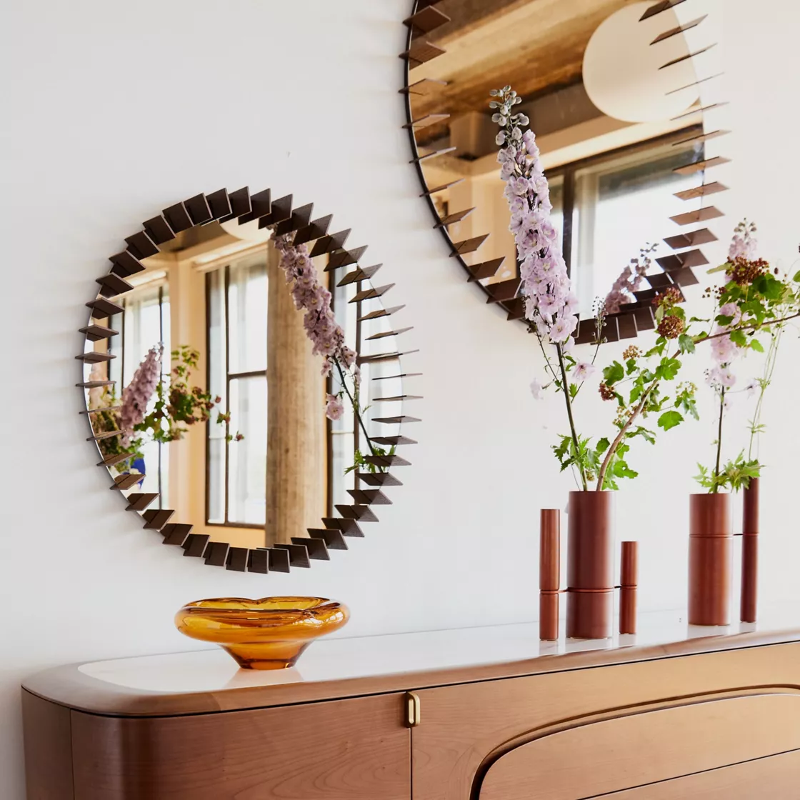 The Turbine Mirror by Renaud Thiry is a striking piece where craftsmanship meets kinetic design. Inspired by the dynamic motion of a turbine, the mirror features sculpted wooden blades radiating around a bronzed central glass — a perfect balance of geometry and organic texture.