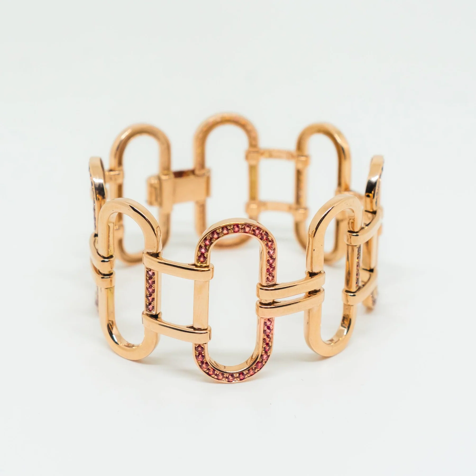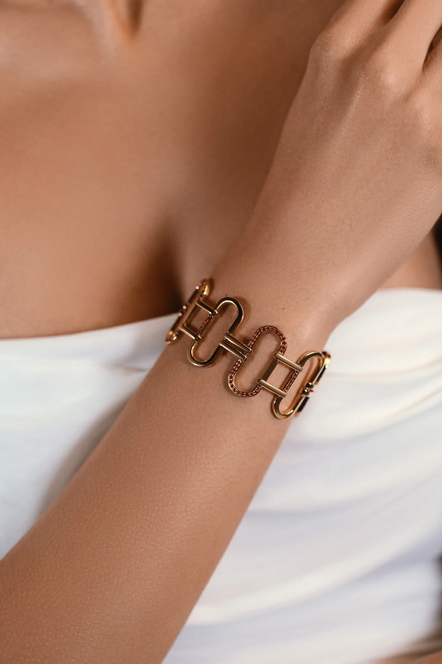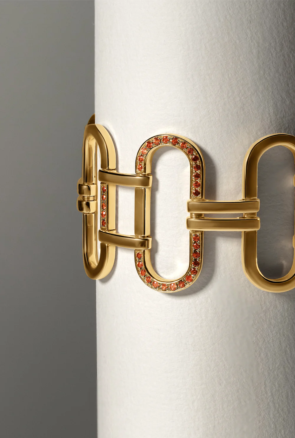 Timeless elegance meets modern craftsmanship in the Romance Bracelet by Charlotte.B. Crafted in 18k yellow gold and adorned with 142 orange sapphires, this flexible cuff-style bracelet radiates warmth and sophistication. Its refined design ensures a perfect fit and effortless allure — whether worn alone or as part of a statement look.