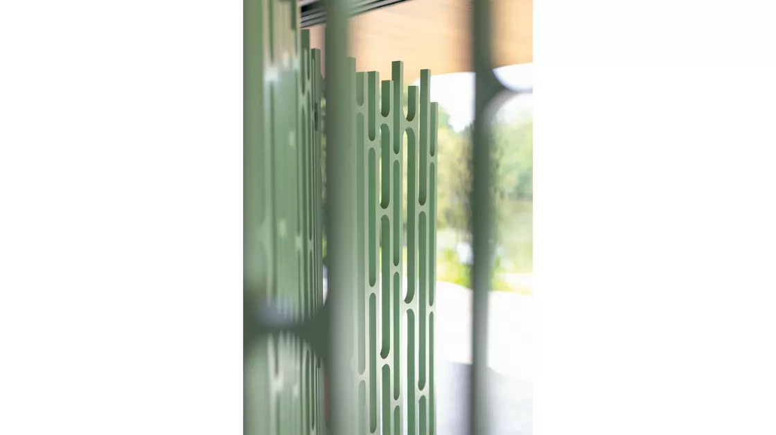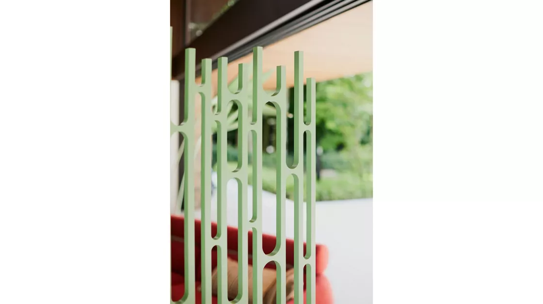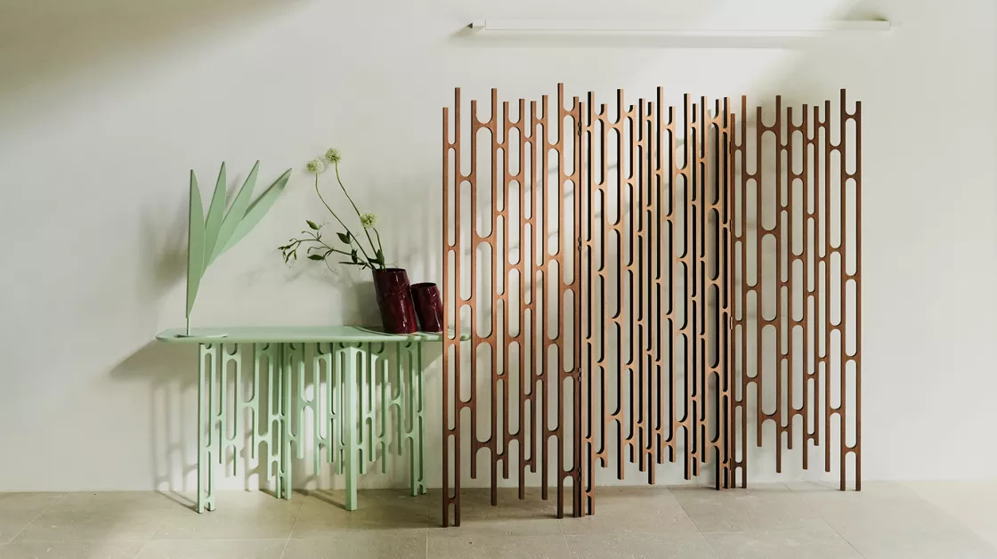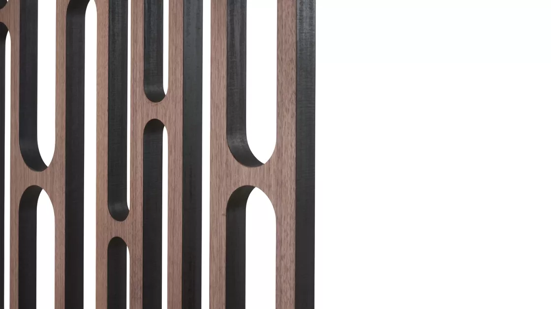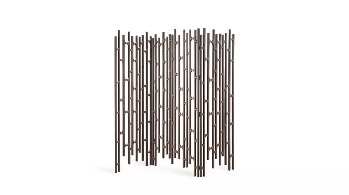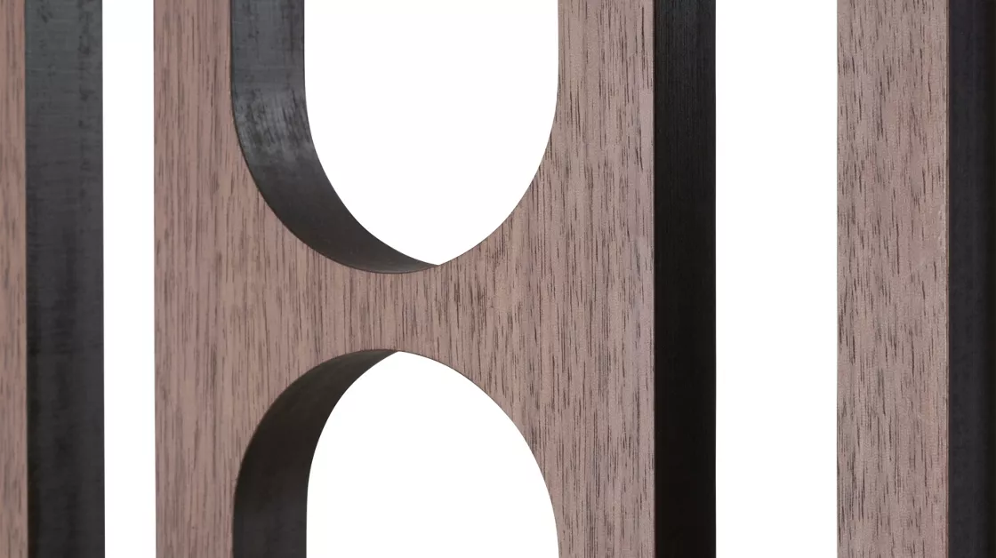 Crafted in natural walnut veneer, the screen is double-sided and features a refined composition of Compact Plus high-density fiber panels connected by Onyx-finish stainless-steel hinges. The clean geometry and warm wood tone create a subtle architectural rhythm, perfect for defining spaces or enhancing visual harmony in refined interiors.
