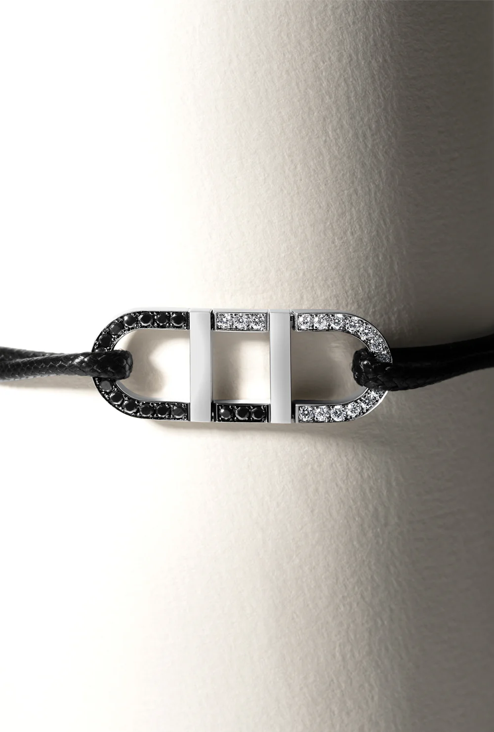 An ode to contrast and sophistication, the Explorer Bi-Color Bracelet by Charlotte.B captures the essence of modern elegance. Designed and crafted in Monaco, this piece brings together 18k white gold, 17 black diamonds (0.31 ct), and 17 white diamonds (0.35 ct) set on a refined nylon cord available in multiple colors.