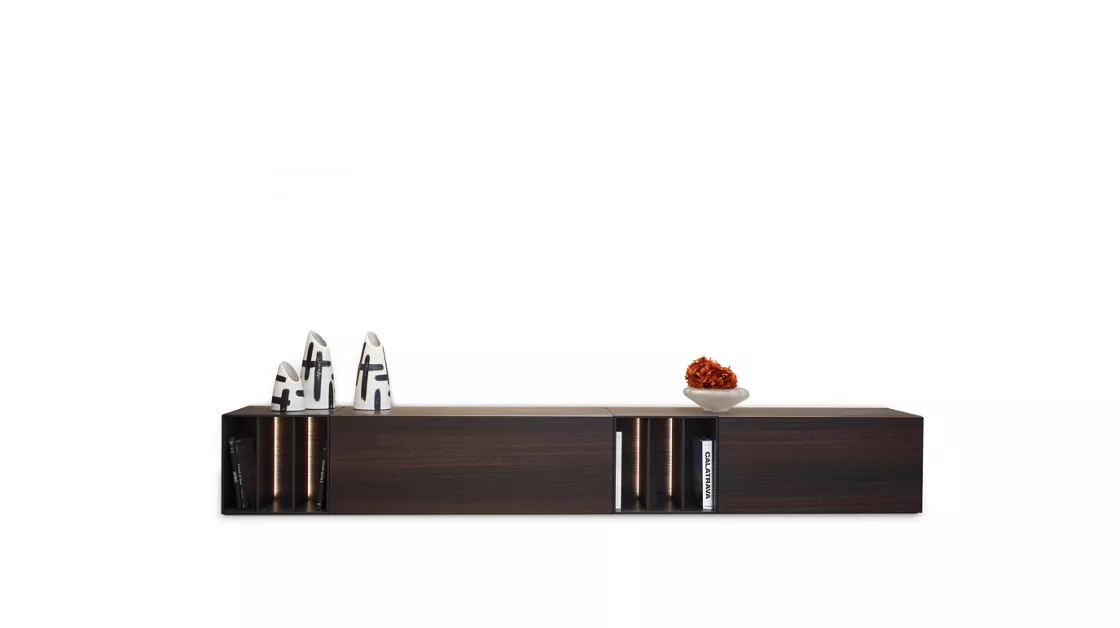The Wallover 2023-10A is a suspended wall-mounted composition that embodies the modern elegance and architectural precision of Roche Bobois. Combining functionality and style, it includes two illuminated shelving modules with three compartments each, a 120 cm drop-down cabinet with top, a 90 cm drop-down cabinet with top and side finish, and full integrated lighting.