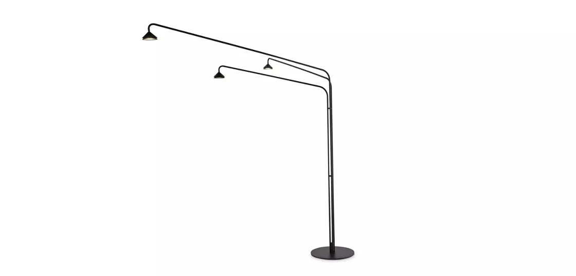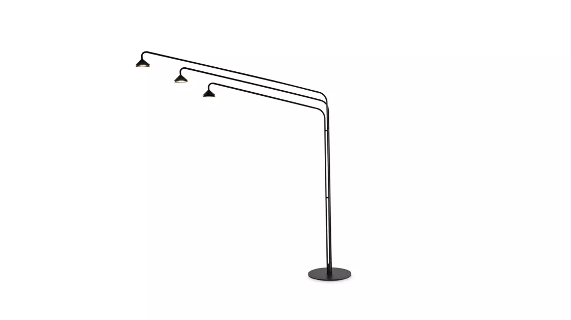 Crafted with three adjustable arms and lacquered black aluminum diffusers, the lamp offers multiple lighting directions to suit any mood or setting. Its steel base and structure provide balance and stability, while the sculptural form adds architectural presence to interiors.