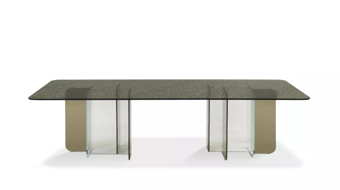 The Ekta dining table by René Bouchara is a masterpiece of transparency and light, where design meets architectural precision. Its monumental presence is softened by the ethereal beauty of Cathedral laminated glass, creating a striking dialogue between structure and fluidity.
