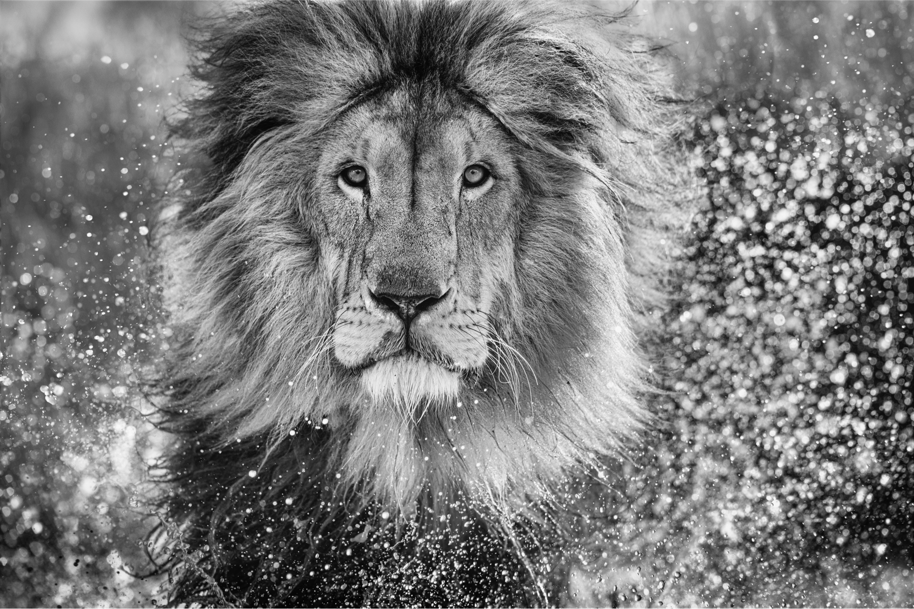 A striking black-and-white fine art photograph capturing the raw majesty and intensity of a lion in motion — surrounded by a spray of water that evokes both power and serenity.
