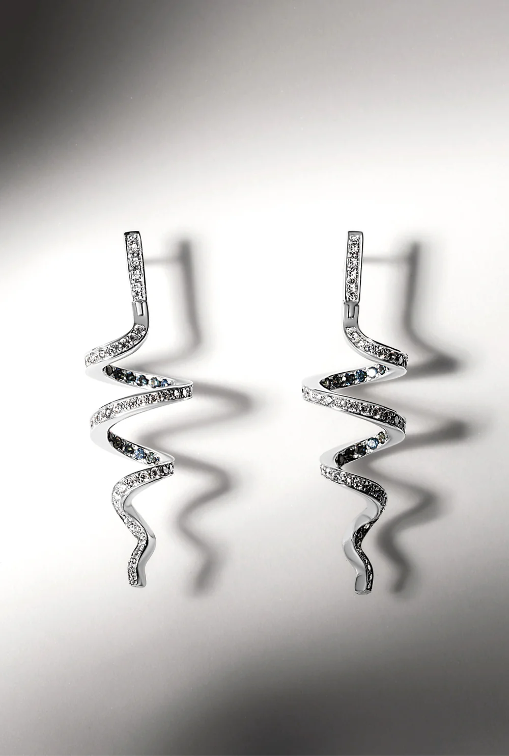 The Spiral Earrings by Charlotte.B are a striking interpretation of elegance in motion. Crafted in 18k white gold and adorned with radiant diamonds and deep blue sapphires, they capture the dynamic beauty of a spiraling form. Handcrafted in Monaco, this design reflects refined craftsmanship and bold creativity.