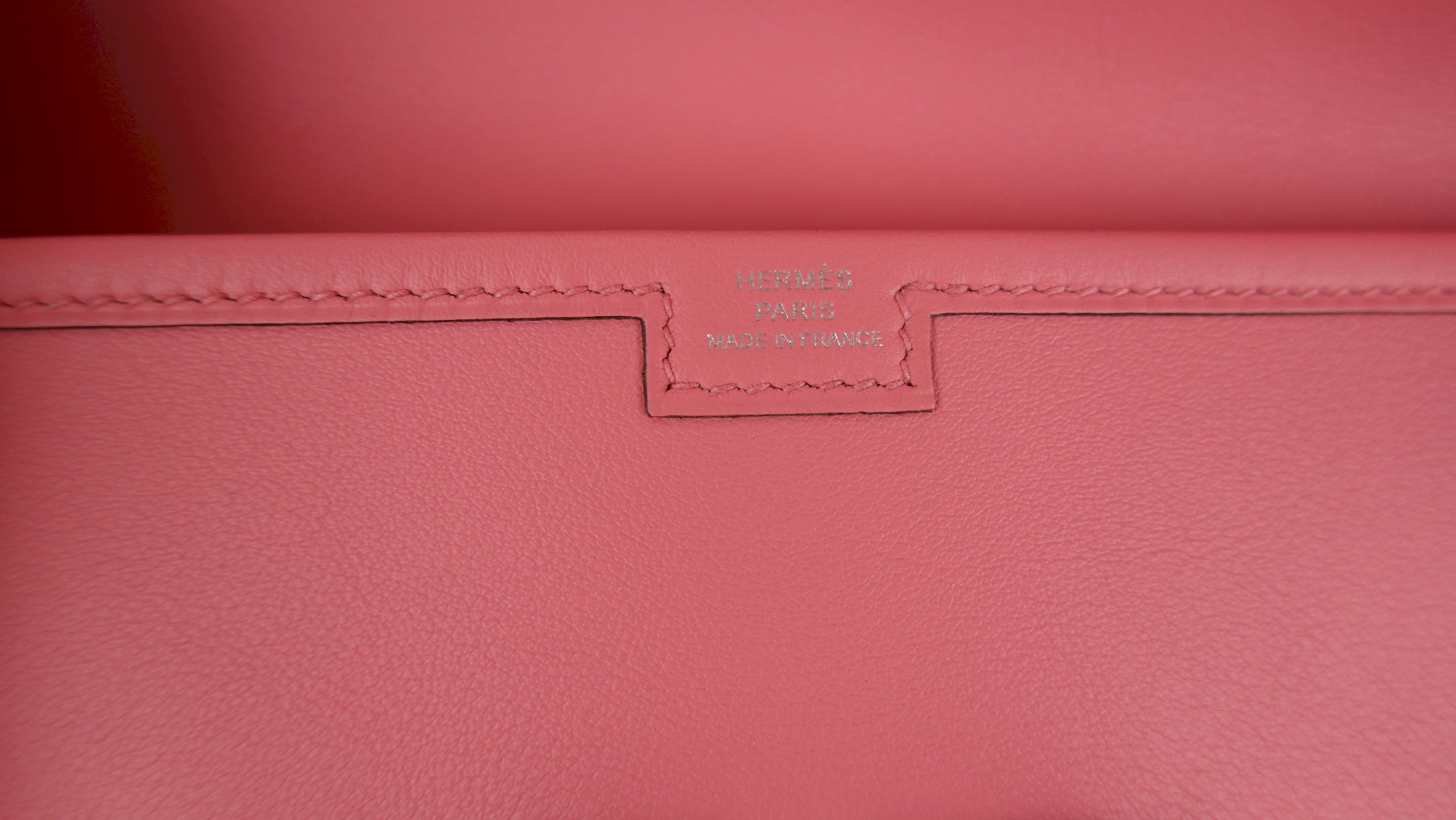 The Hermès Jige clutch in pink Swift leather is an icon of understated elegance and refined craftsmanship. Its sleek silhouette, soft leather, and signature “H” closure make it a timeless accessory for both day and evening wear.