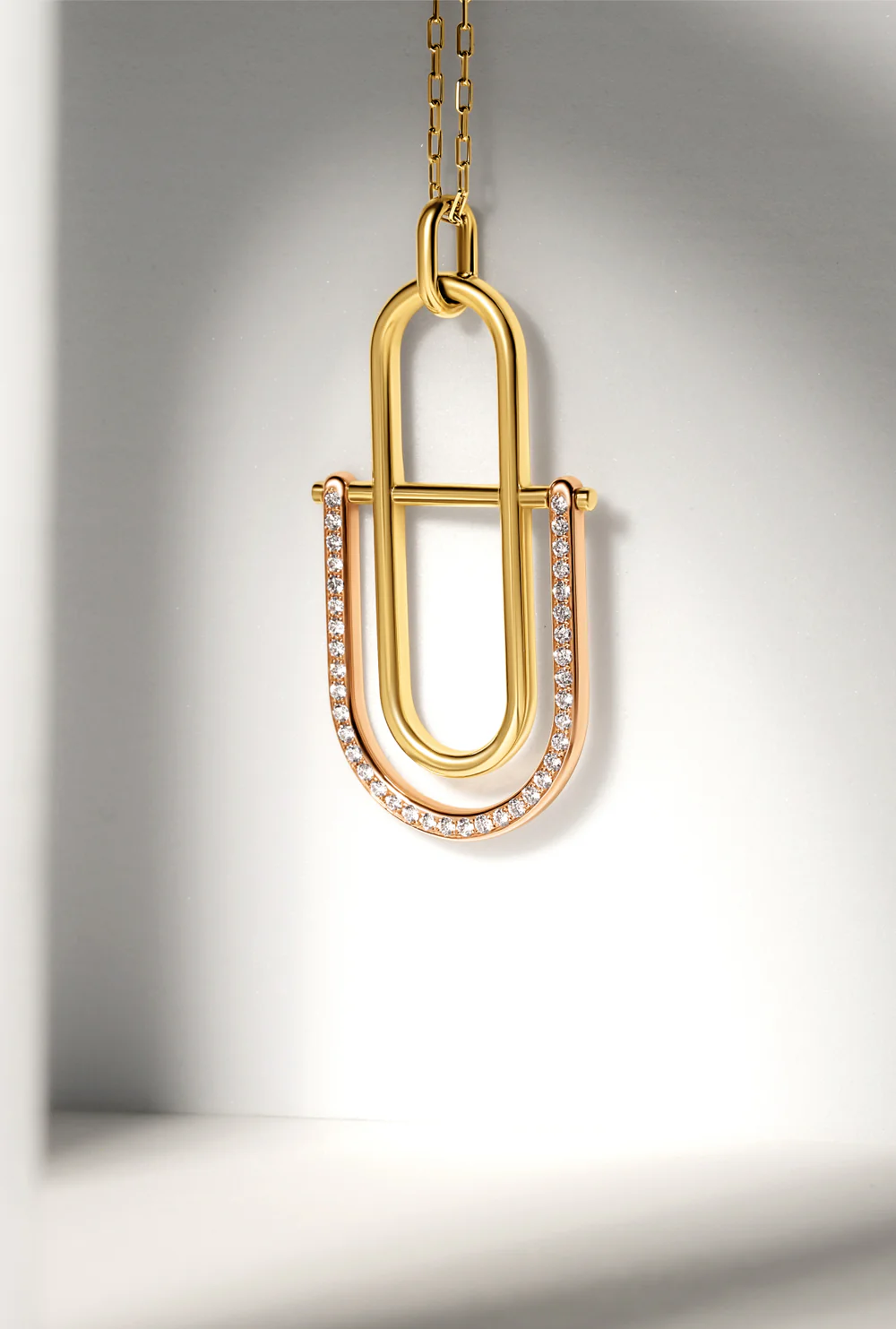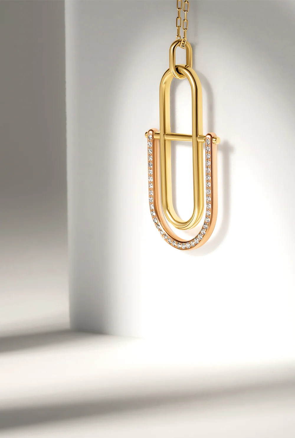 The Duo Romance Sautoir by Charlotte.B is the signature statement piece of the Romance Collection. Designed with two interlinked pendants that move gracefully, this jewel brings a touch of modern bohemian charm to your look while radiating timeless sophistication.