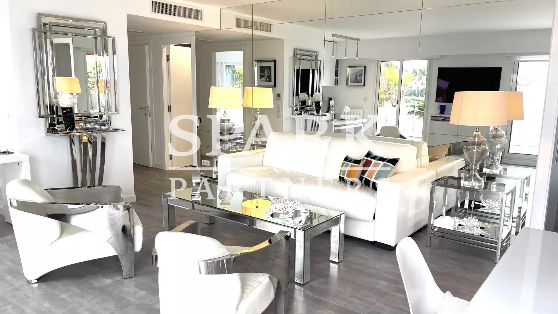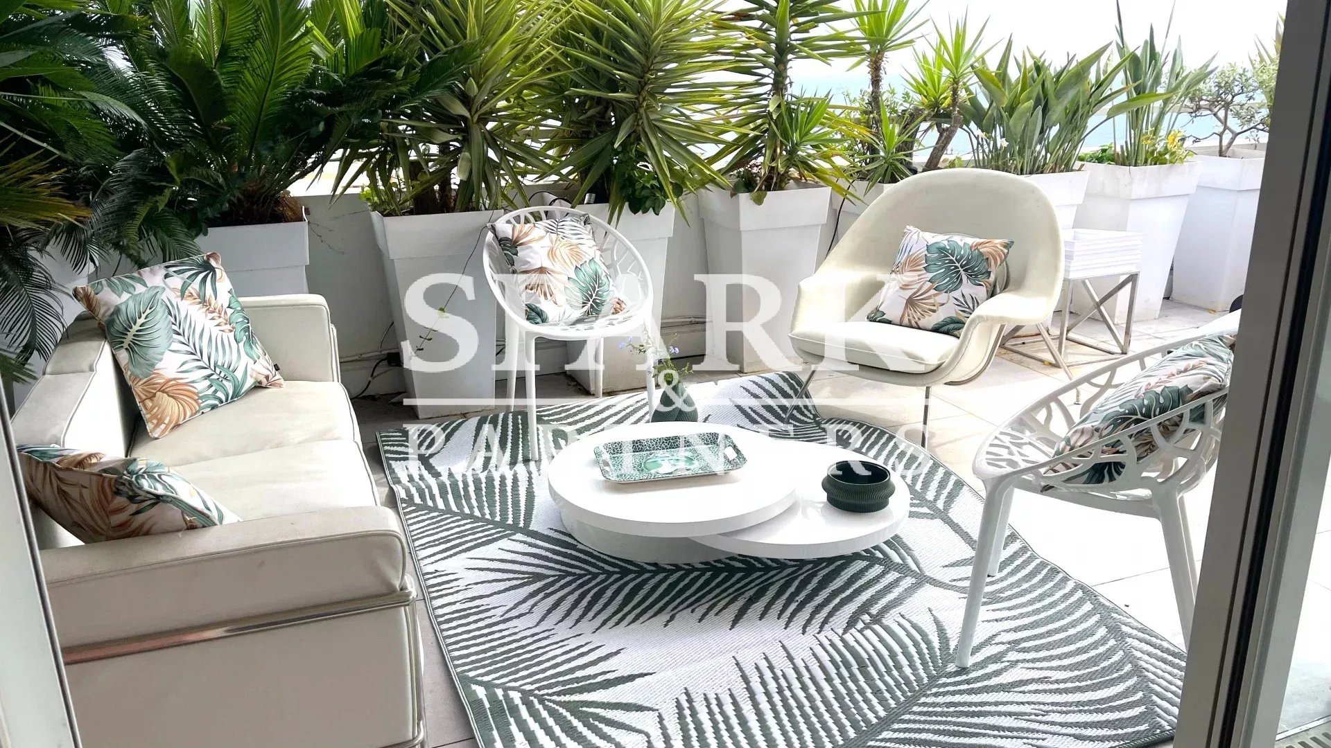 The 76 m² interior is subtly laid out: from the entrance, a vast 31 m² living room bathed in light thanks to three bay windows opens onto a 56 m² open-air terrace, a true extension of the living area, where the blue of the sea becomes a permanent backdrop.