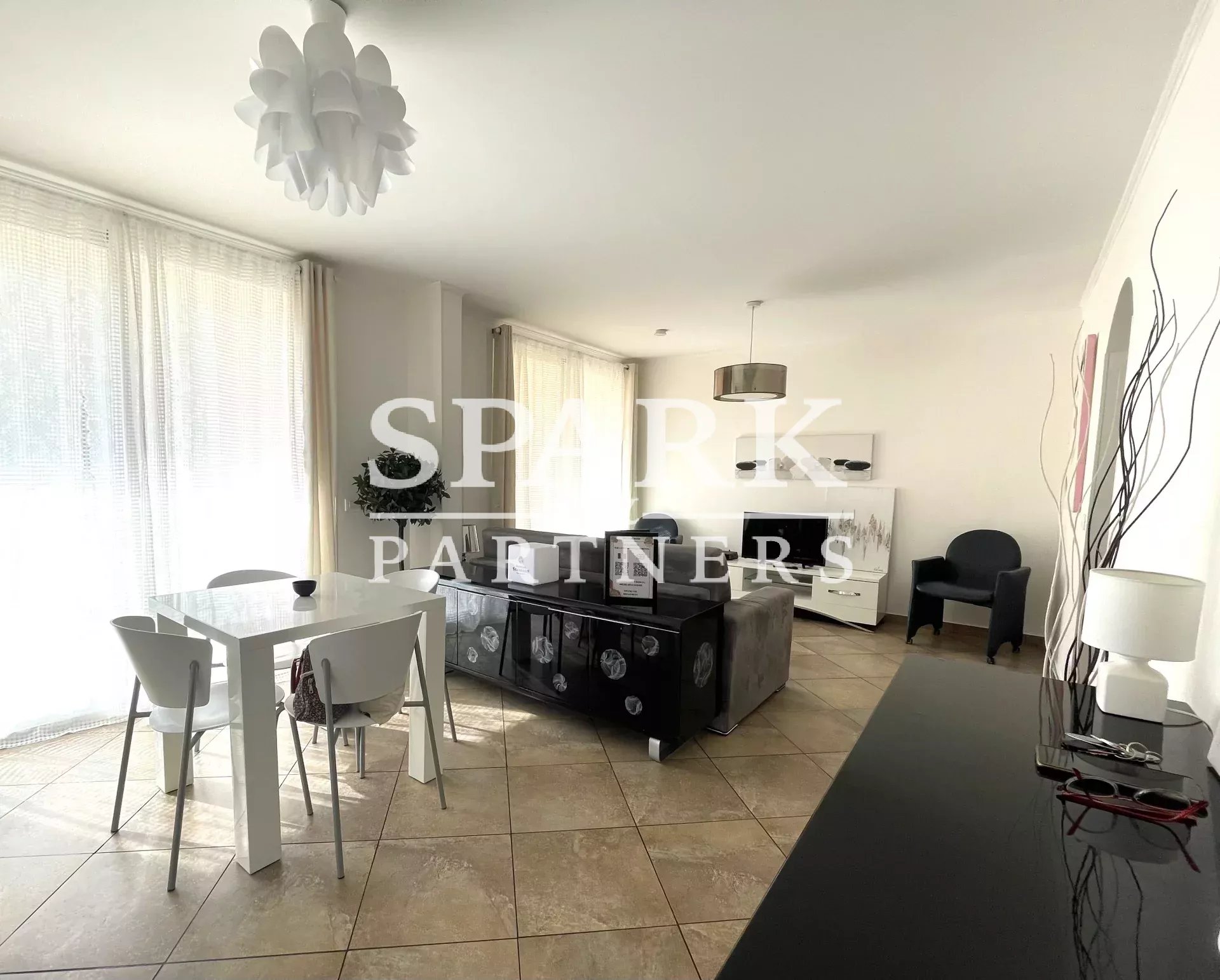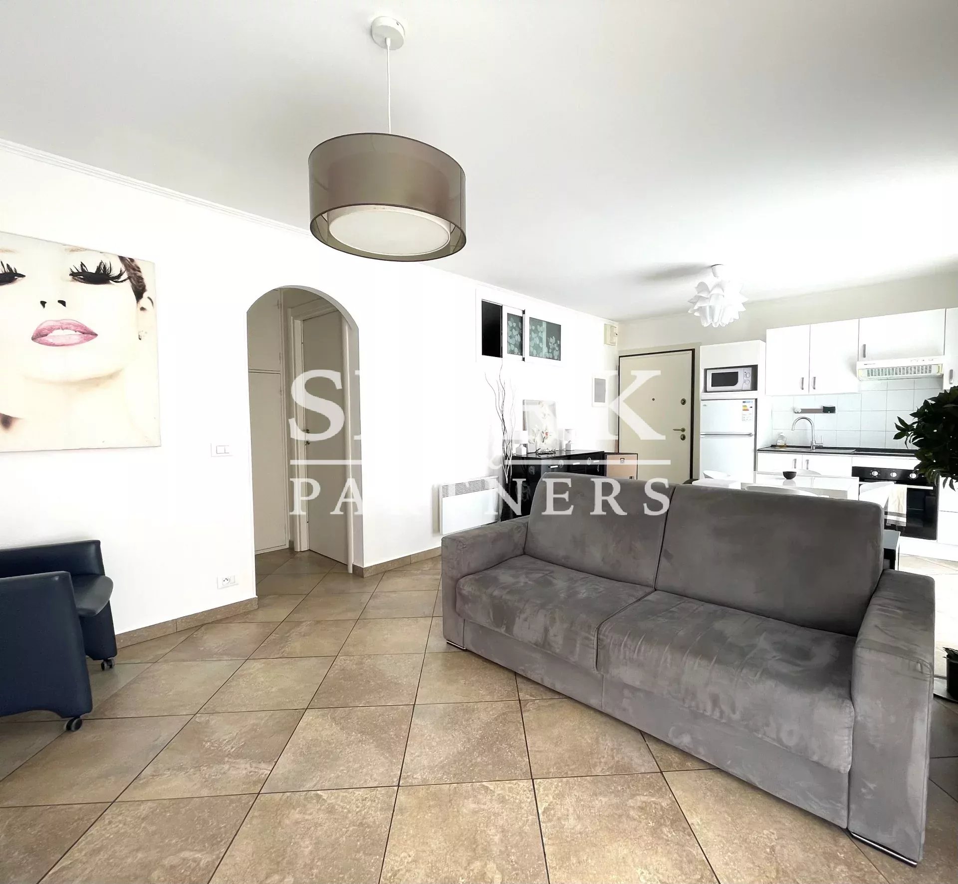 The apartment comprises an entrance hall, a fitted kitchen opening onto the living room, a bedroom with fitted closets and a shower room.