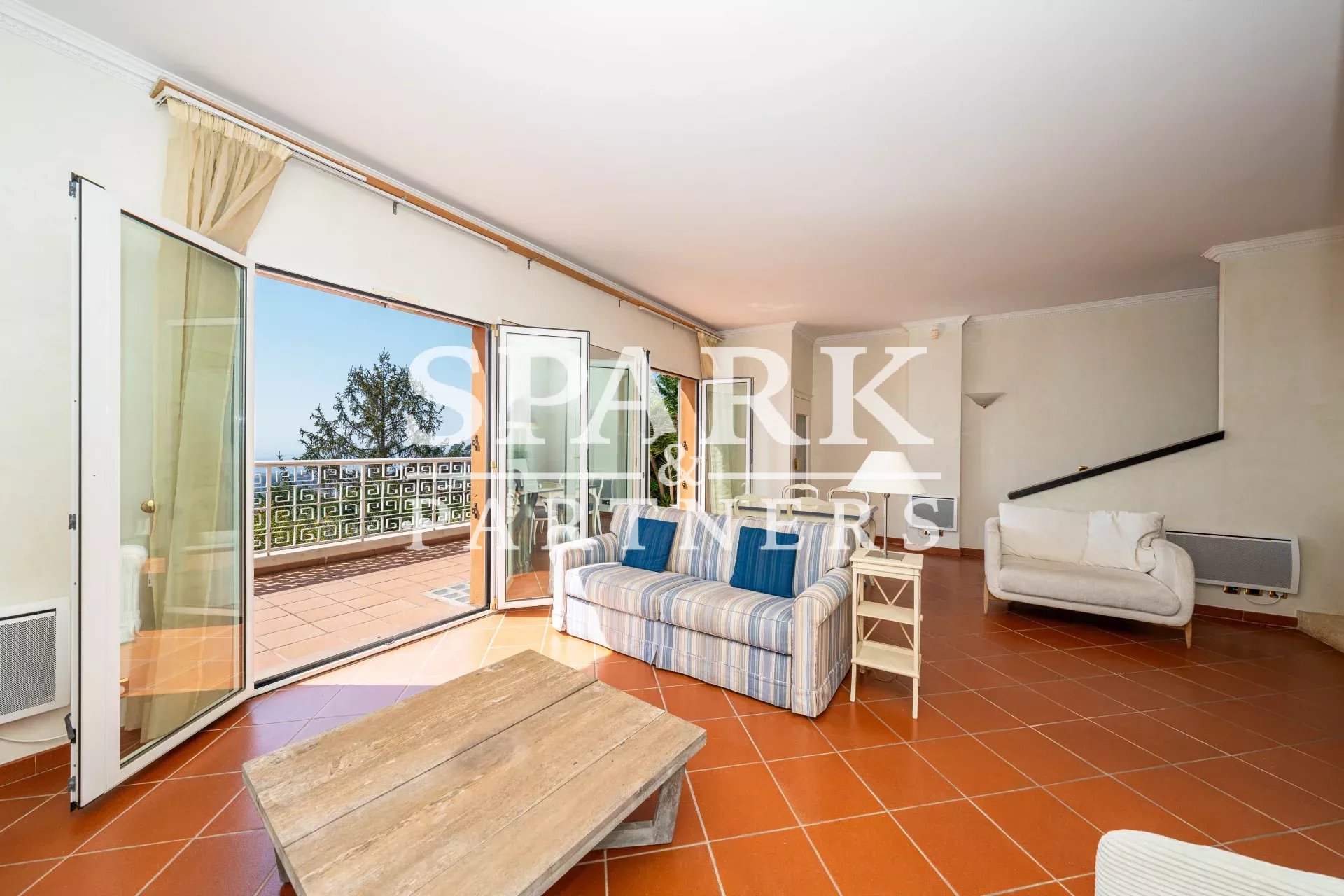 Built on three levels and served by elevator, it comprises a living room, dining room with fireplace opening onto a sea-view terrace, 3 bedrooms with bathrooms, independent fitted kitchen.