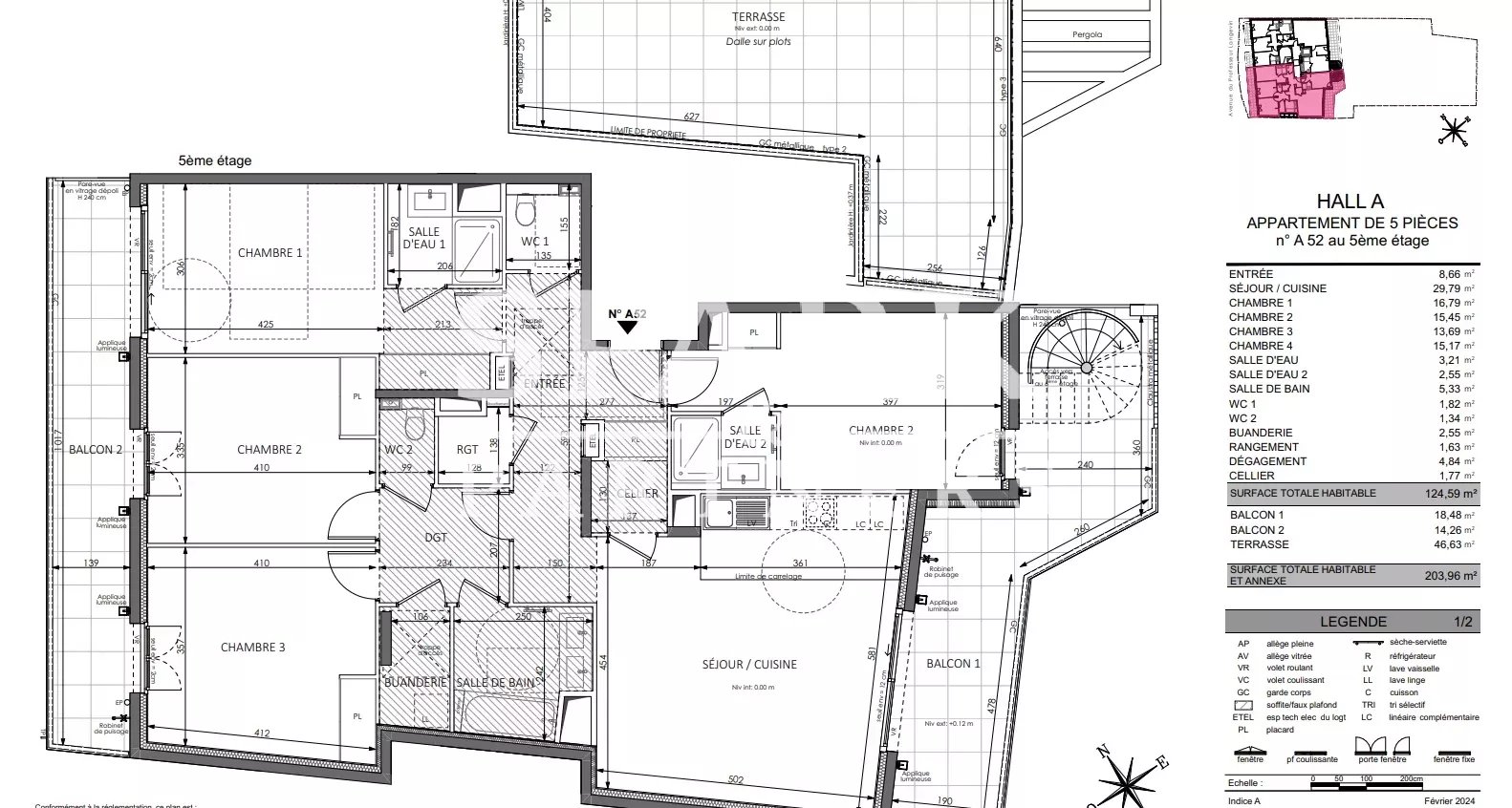 This 5-room apartment comprises an entrance hall, a spacious living room with open kitchen, 4 bedrooms, 2 shower rooms, a bathroom, 2 guest toilets, a laundry room, a storage area and a hallway, a storeroom and two balconies and a beautiful roof-terrace.