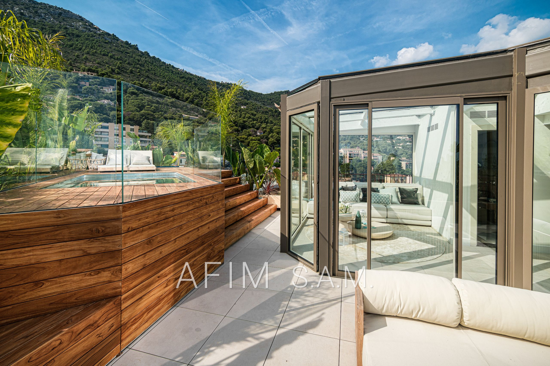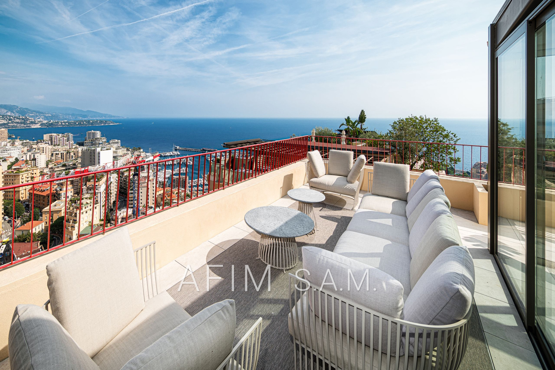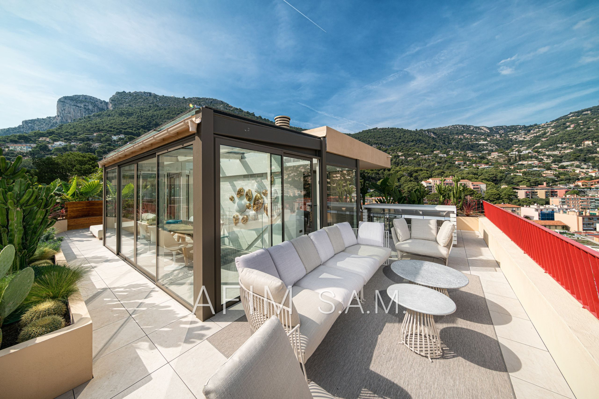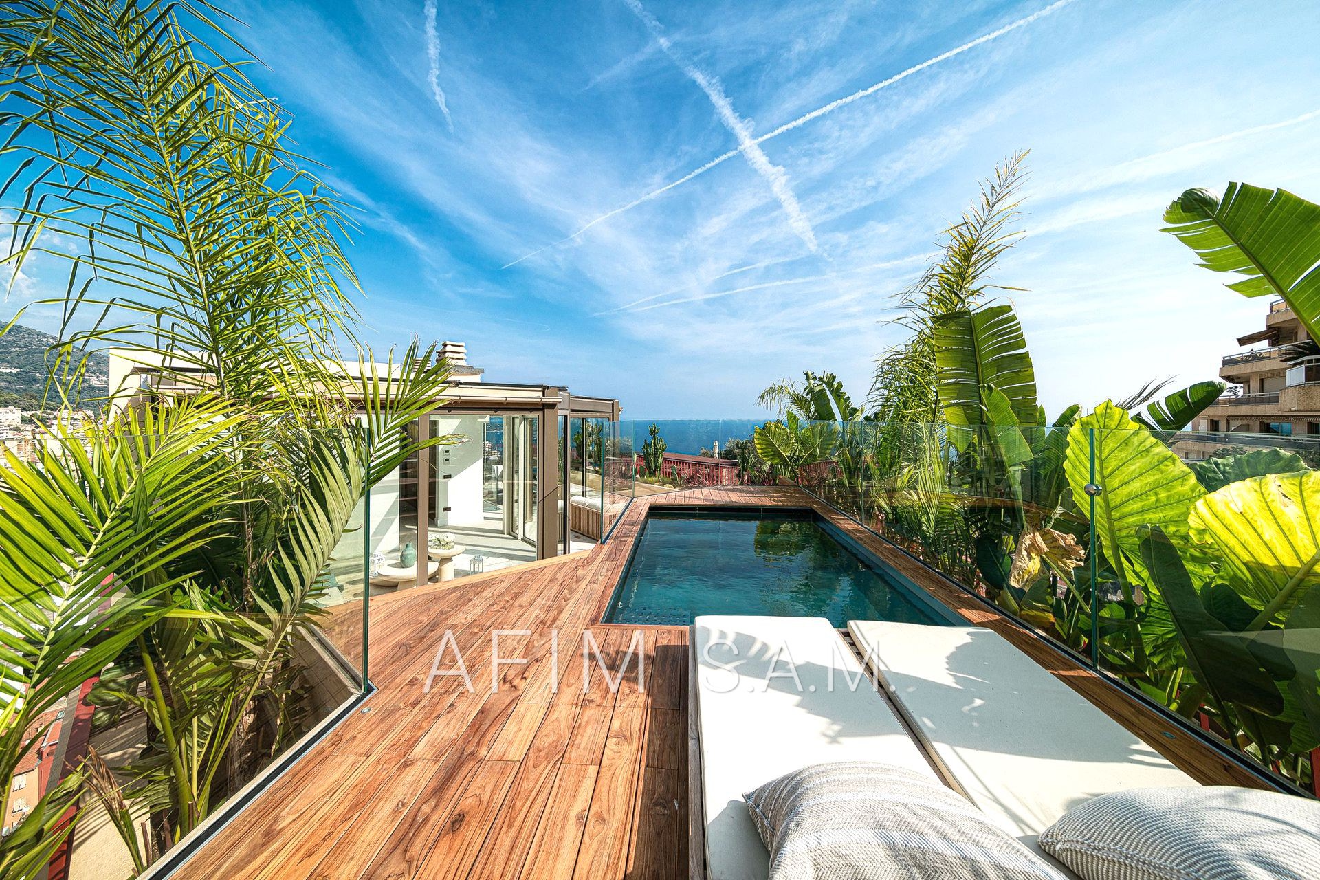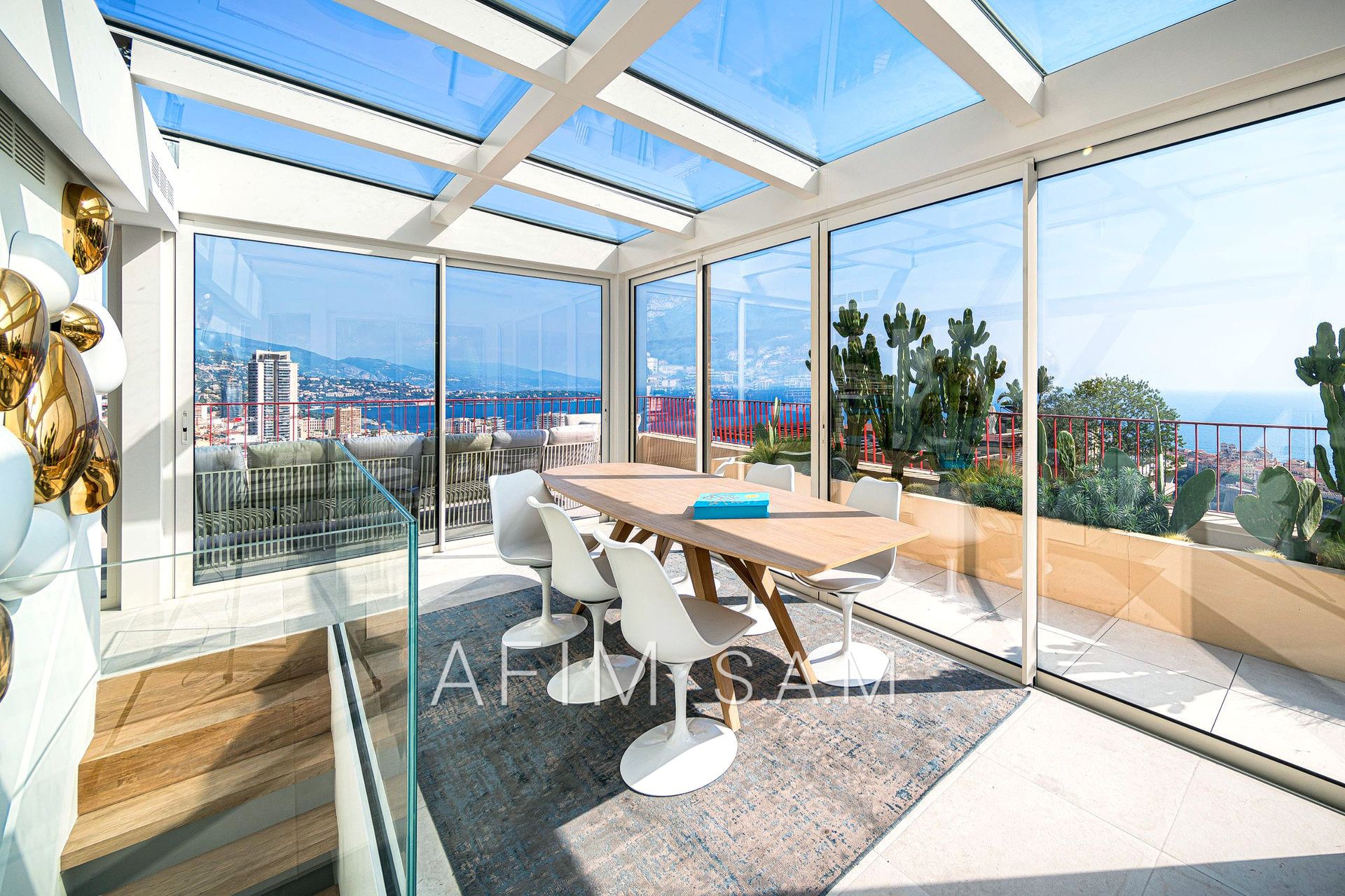 CO-EXCLUSIVITÉ – Offrant une belle vue Mer et Principauté, cet ÉLEGANT DUPLEX de 5 PIECES, avec PISCINE sur son toit terrasse, a été rénové en totalité avec des matériaux de haute qualité. Ses 426 m² de surface totale répartis sur 2 étages sont disposés ainsi :