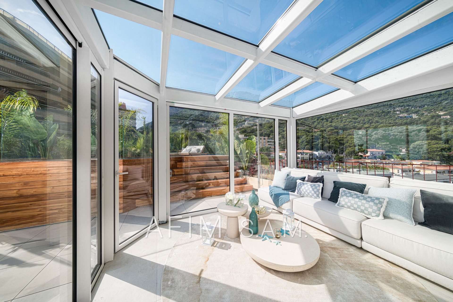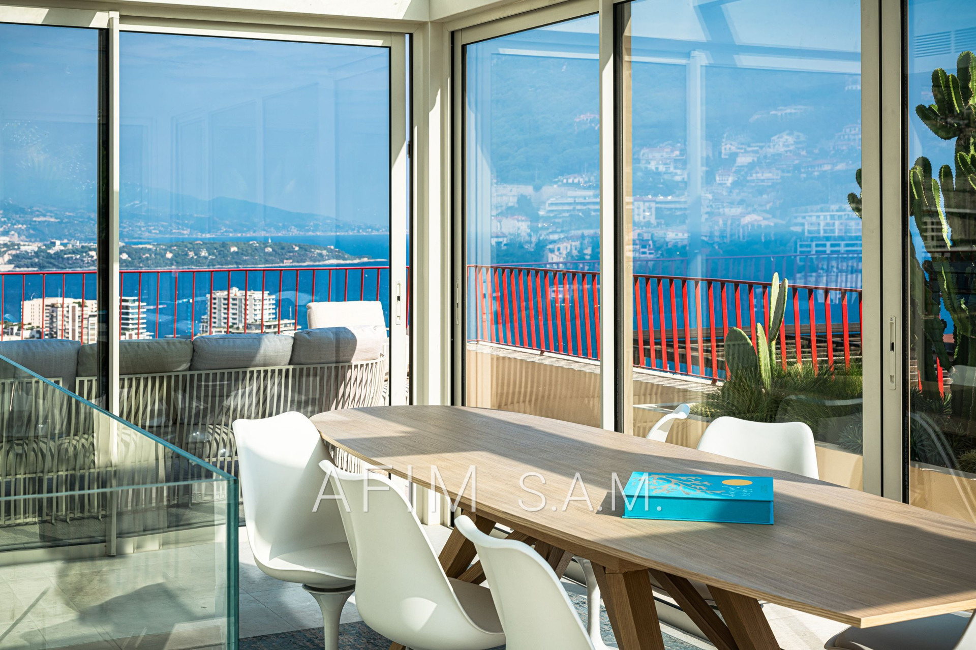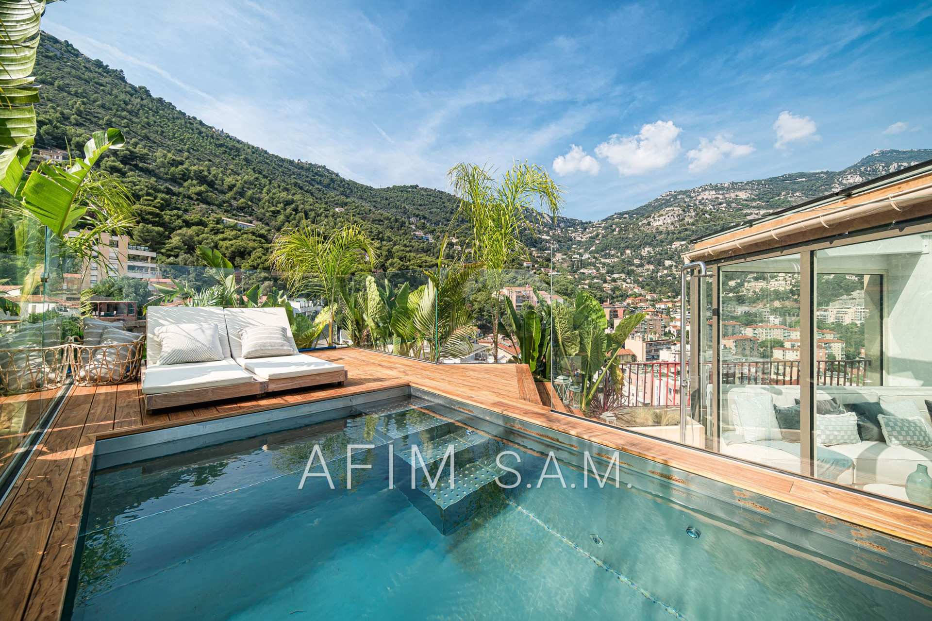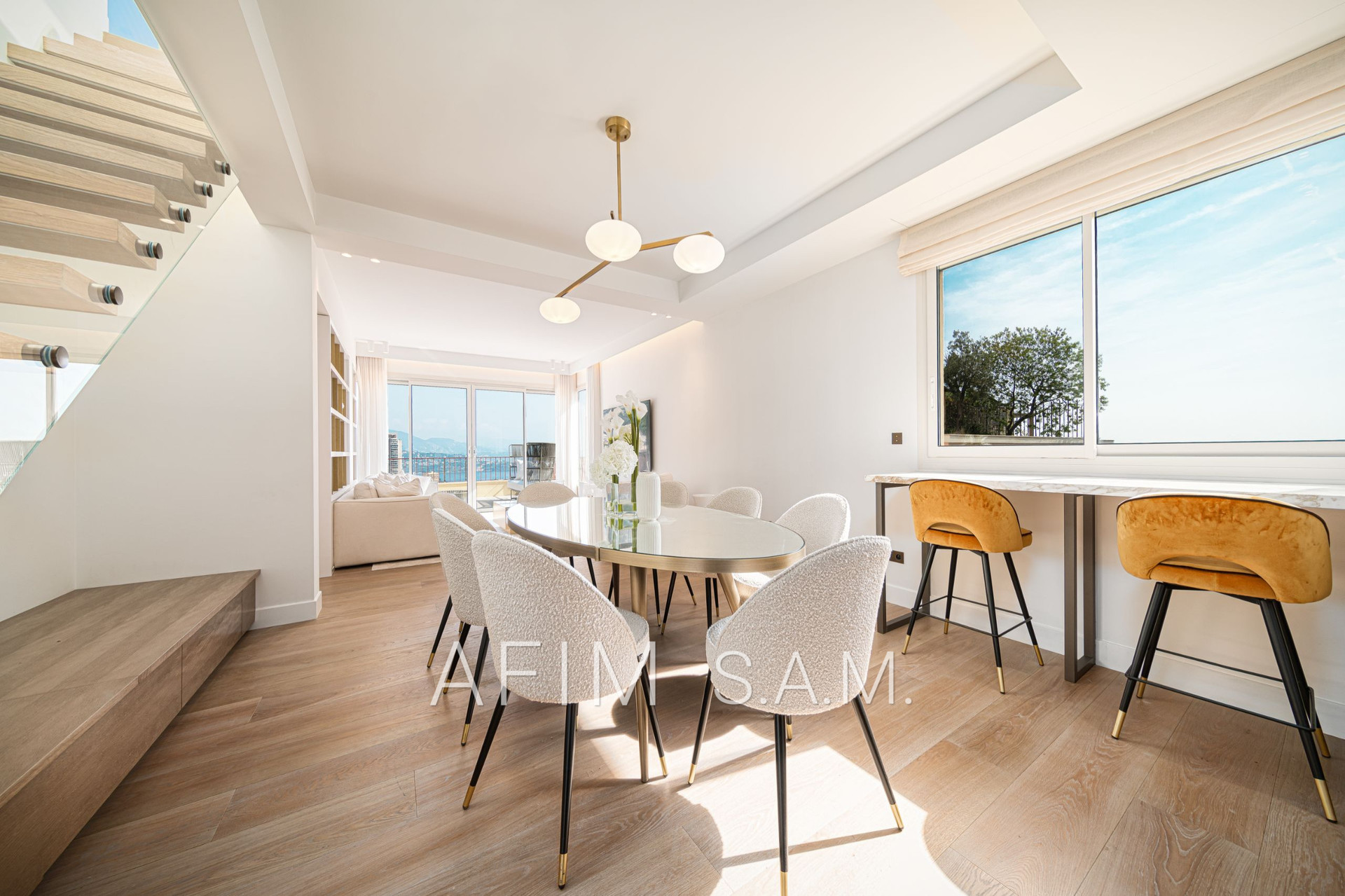 CO-EXCLUSIVITÉ – Offrant une belle vue Mer et Principauté, cet ÉLEGANT DUPLEX de 5 PIECES, avec PISCINE sur son toit terrasse, a été rénové en totalité avec des matériaux de haute qualité. Ses 426 m² de surface totale répartis sur 2 étages sont disposés ainsi :