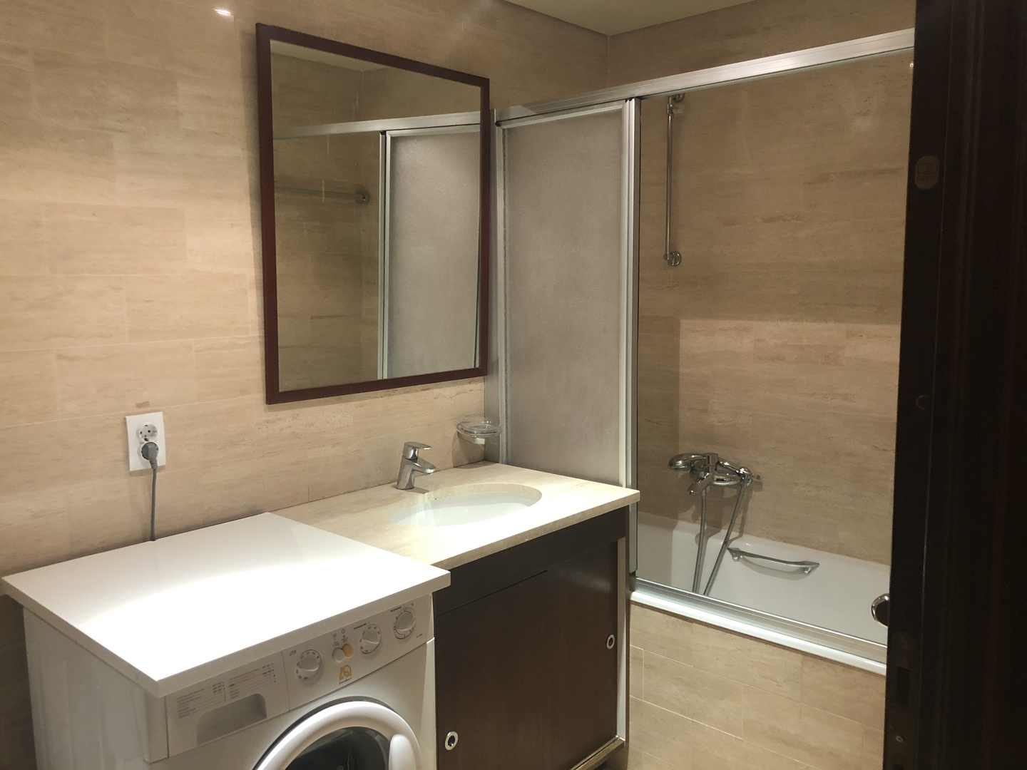The apartment features a double sofa bed, double front door, armored electric blinds, and marble flooring throughout. The spacious marble bathroom includes both bathtub and shower. Additional amenities: washing machine, dishwasher, reversible air conditioning.