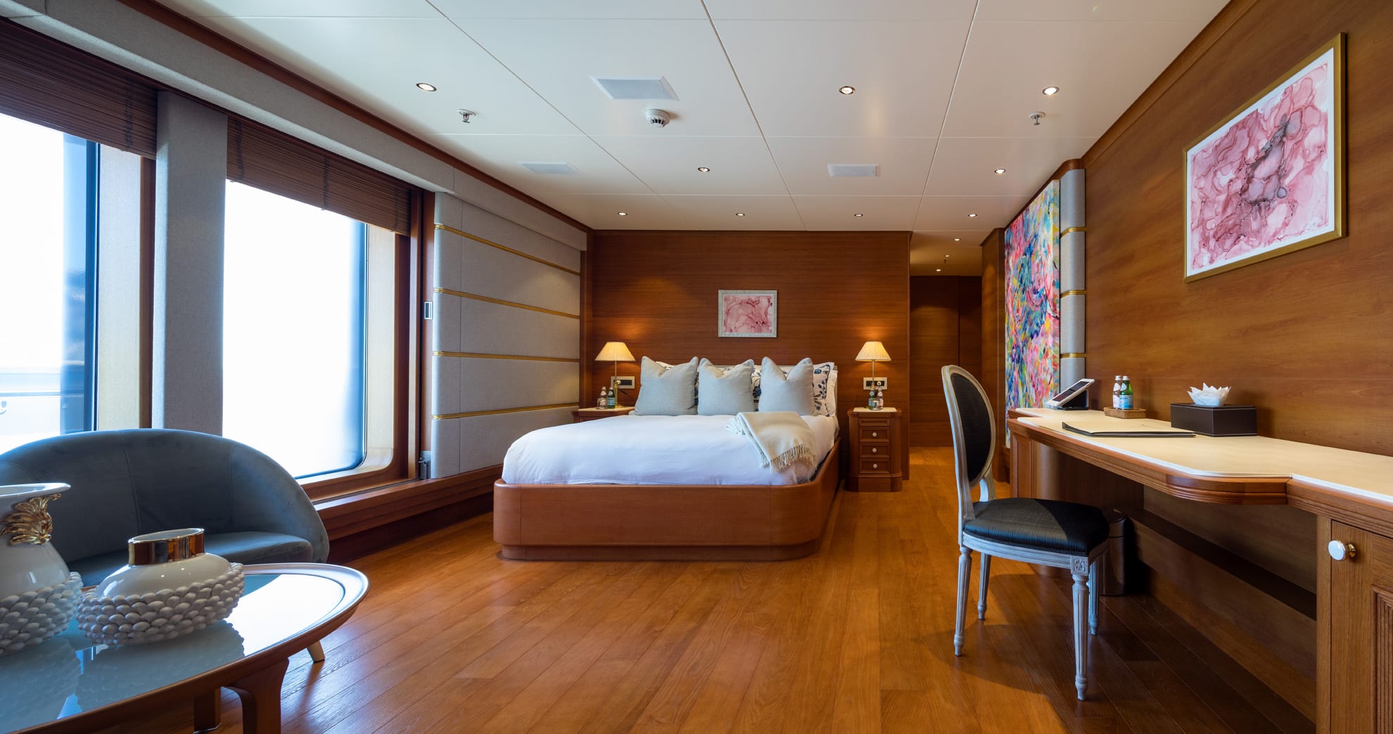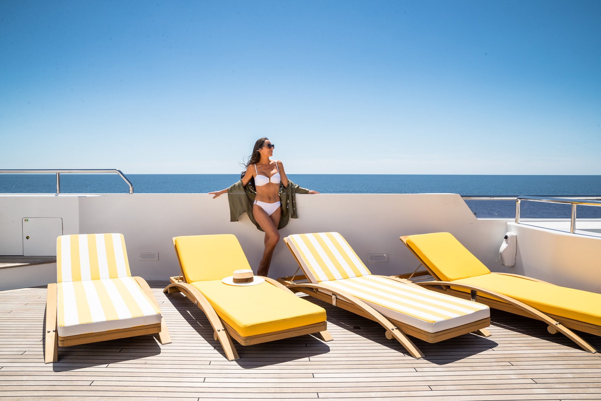Boadicea accommodates 18 guests in 9 luxurious cabins, including two master suites and a VIP suite, each crafted for complete privacy and relaxation. Her interiors blend refined elegance with modern touches, while the expansive decks feature a spa with massage and beauty treatments, cinema, gym, and jacuzzi.