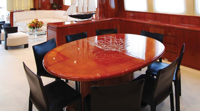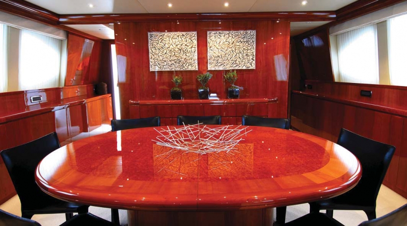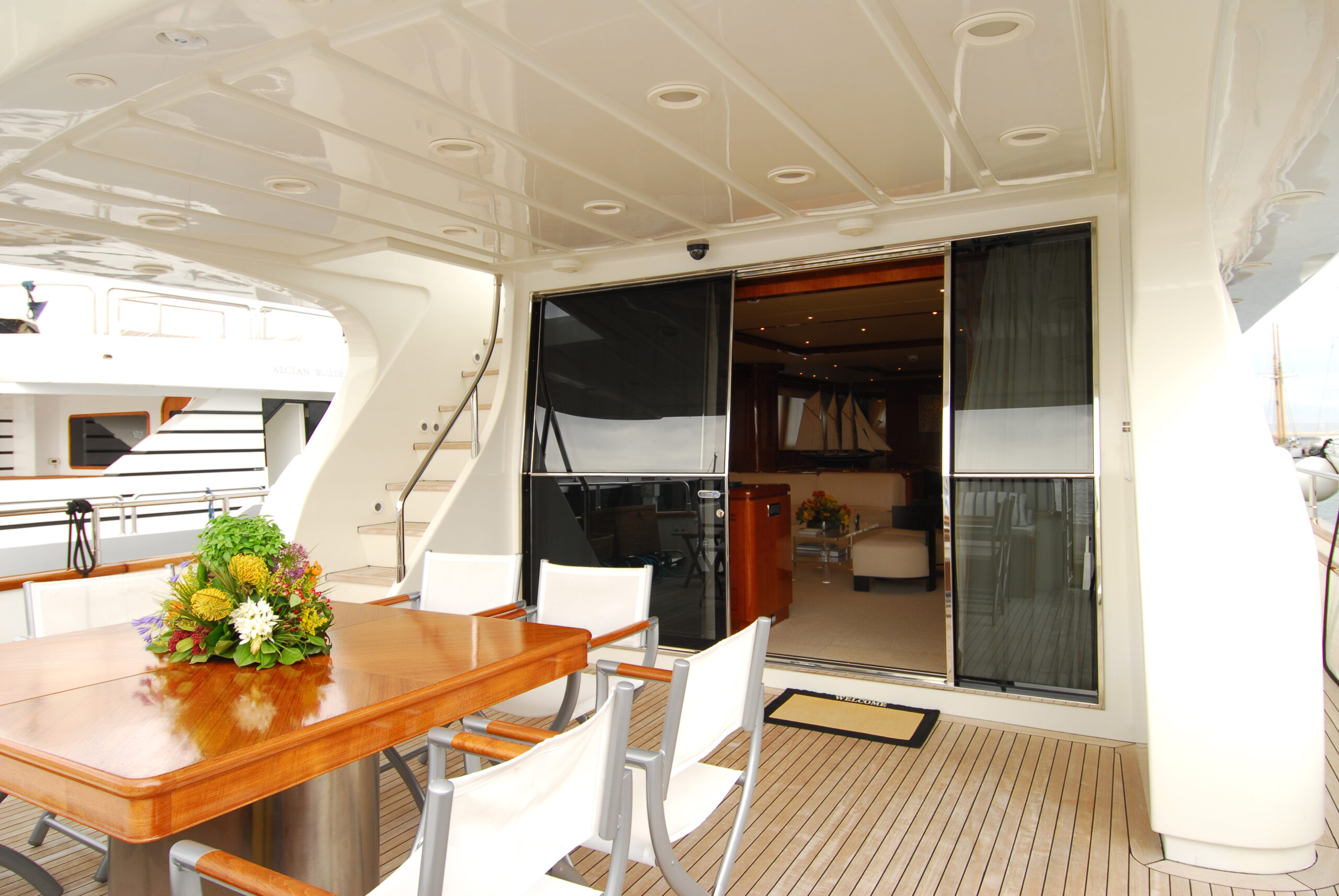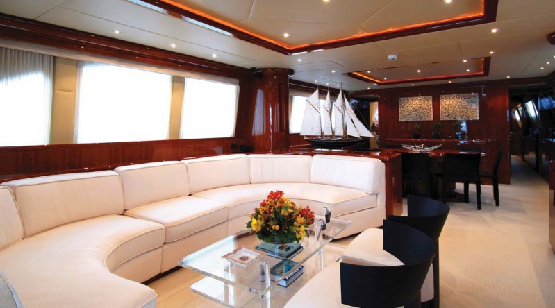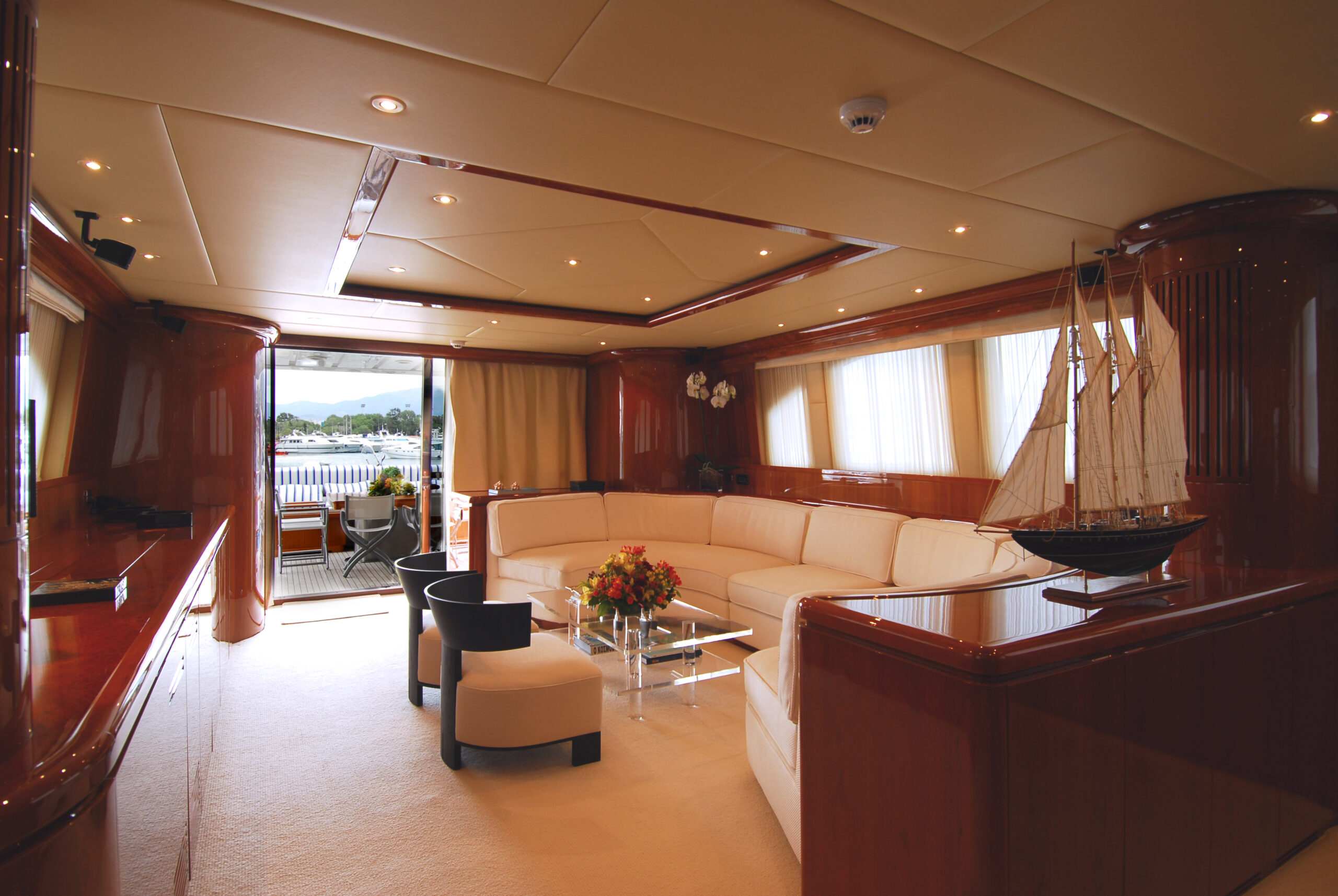 The main salon features a refined open-plan layout with a comfortable lounge and a forward dining area, while her outdoor decks offer multiple spaces for entertaining, dining, and relaxation.