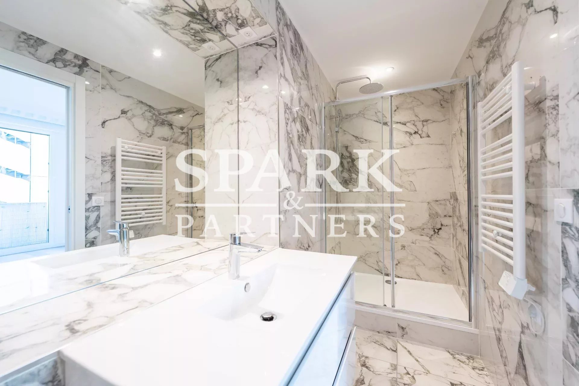 With a total surface area of 153 m², it comprises a vast corridor leading to all rooms: a bright living room with open kitchen, a spacious terrace, two bedrooms with private shower rooms, one of which has direct access to the terrace, as well as a third bedroom with its own bathroom and access to the rear terrace. A guest toilet completes this property.