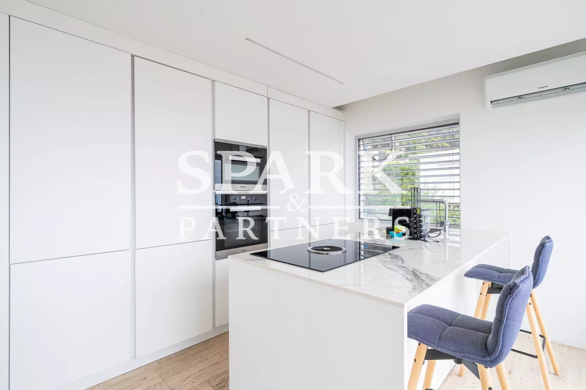 With a surface area of approx. 50m2, it comprises a spacious living room with fully equipped open kitchen, terrace, bedroom, shower room, dressing room, guest toilet and storage space.
