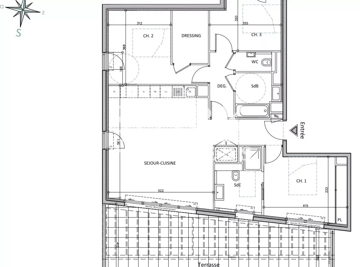 With a surface area of 93.72 m², this apartment offers a beautiful living space extended by a vast 39.04 m² terrace, ideal for enjoying the Mediterranean climate. It comprises an entrance hall, a bright living room with open kitchen, three bedrooms, a bathroom, a shower room, a dressing room, a hallway and a guest toilet.