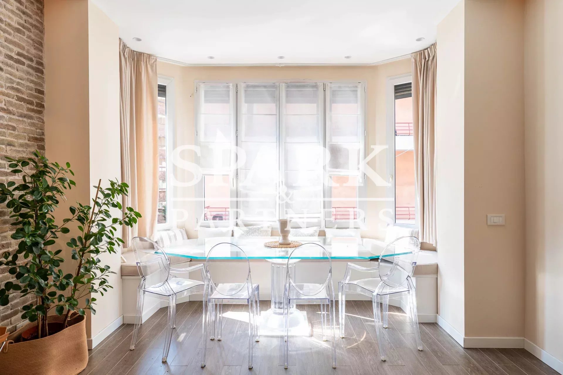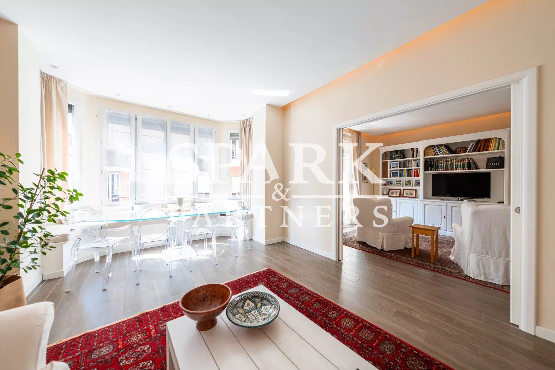 With a floor area of approx. 130 m², it has been entirely renovated using quality materials. The living space opens onto a luminous double living room with bow window, extended by an elegant, fully-equipped open kitchen. One of the living rooms, thanks to sliding doors integrated into the walls, can easily be transformed into a third bedroom as required.
