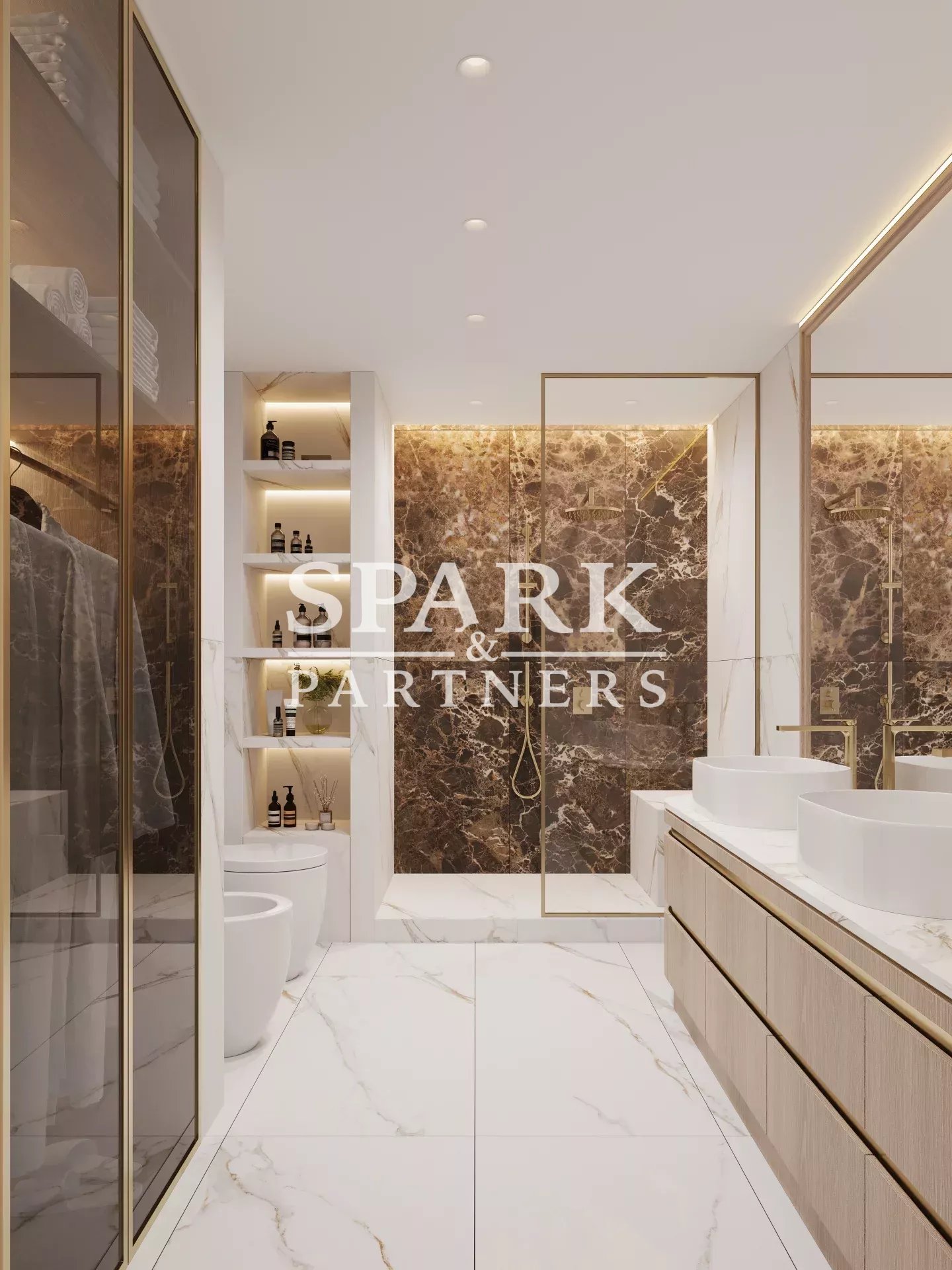 At night, the apartment boasts two bedrooms, each with its own bathroom, as well as an elegant master suite with private bathroom and shower room.
