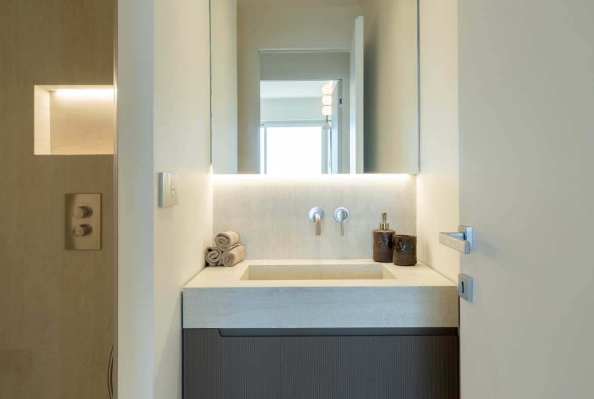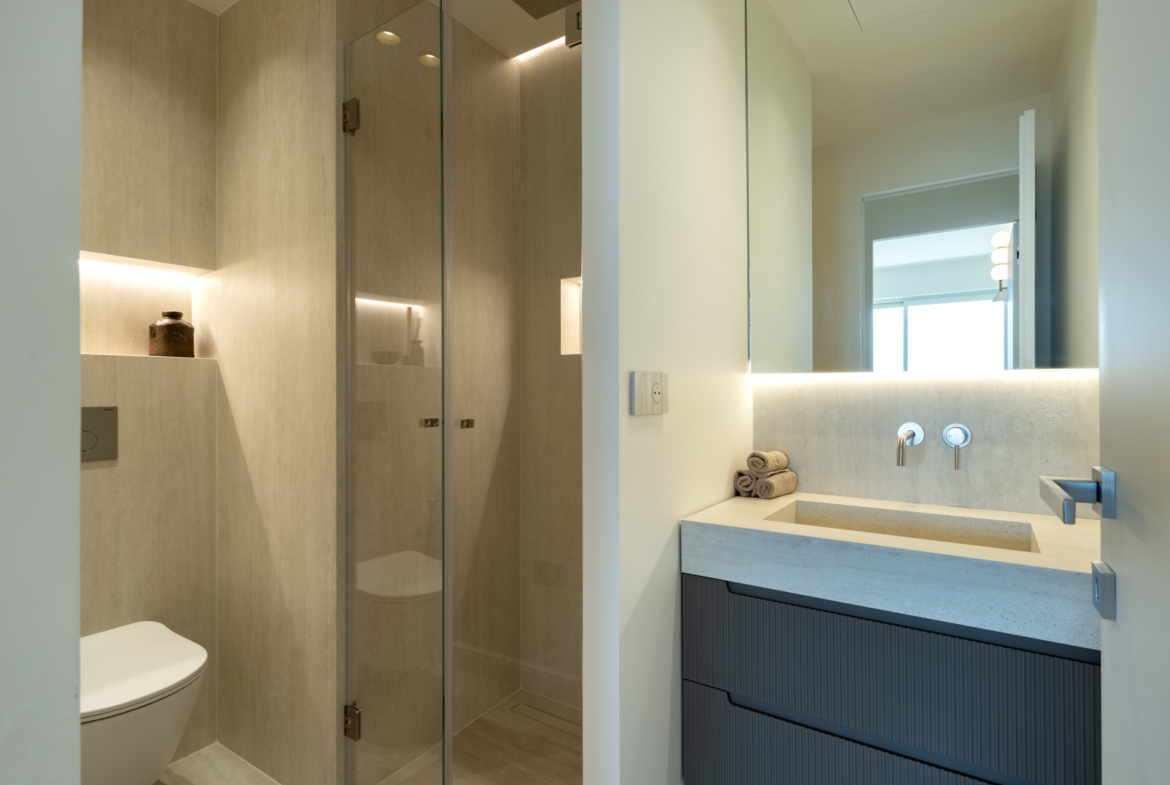 The property offers a spacious, light-filled living room with a fully equipped open-plan kitchen, two comfortable bedrooms, and two modern shower rooms. Built-in wardrobes and custom storage complete this turnkey residence.