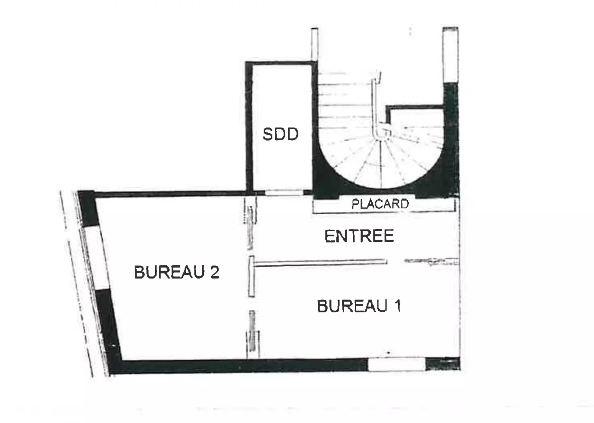The 35 sqm space, in good overall condition, includes an entrance hall, two separate offices, and a shower room. Situated on the first floor of a well-maintained residence with concierge, it also benefits from a large window offering good visibility.