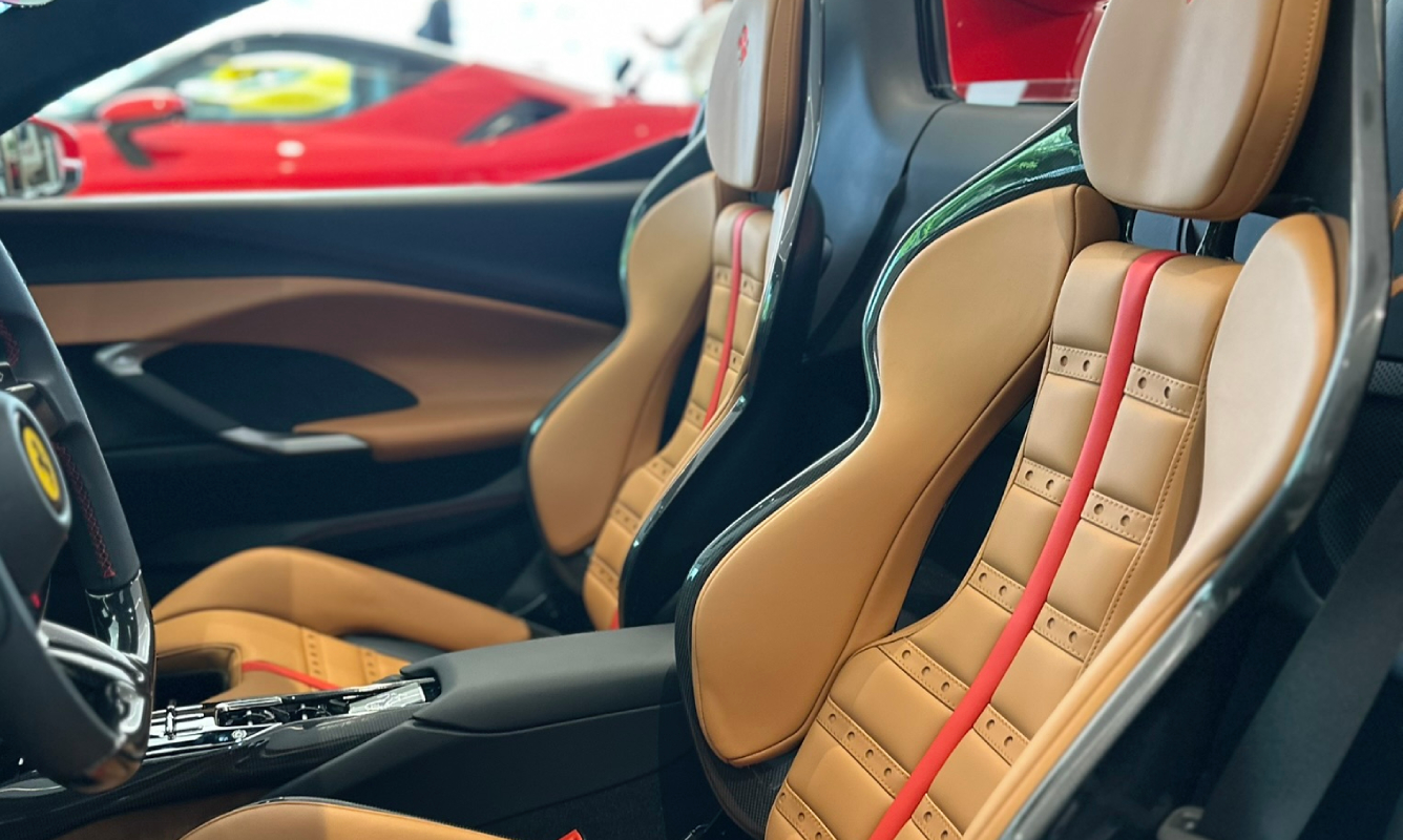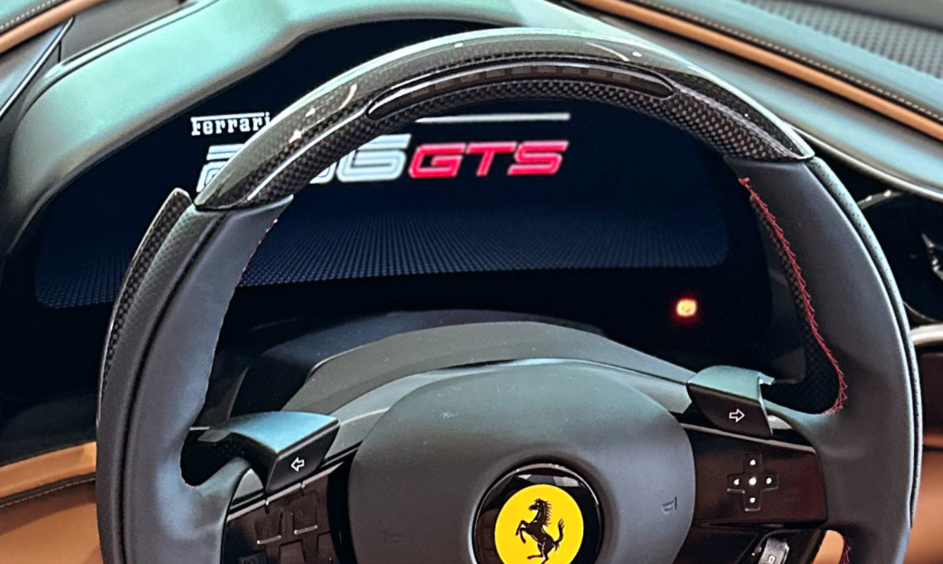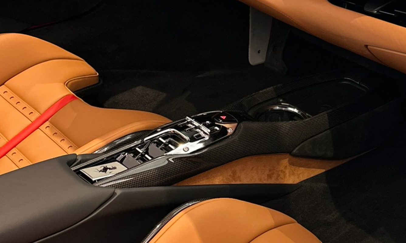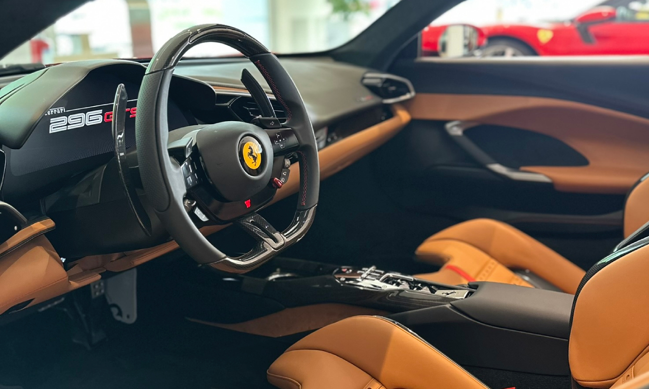 Dressed in iconic Rosso Corsa, the 296 GTS pairs performance with beauty. The Cuoio leather interior, Daytona carbon-fiber seats, and Rosso Ferrari accents create an atmosphere of pure Italian luxury. Carbon fiber details across the cockpit — including the LED steering wheel, center tunnel, and paddles — emphasize its race-ready spirit.