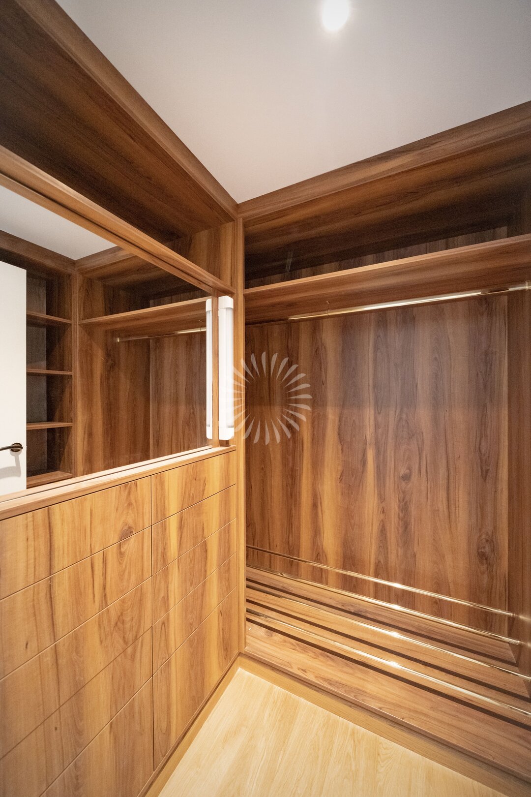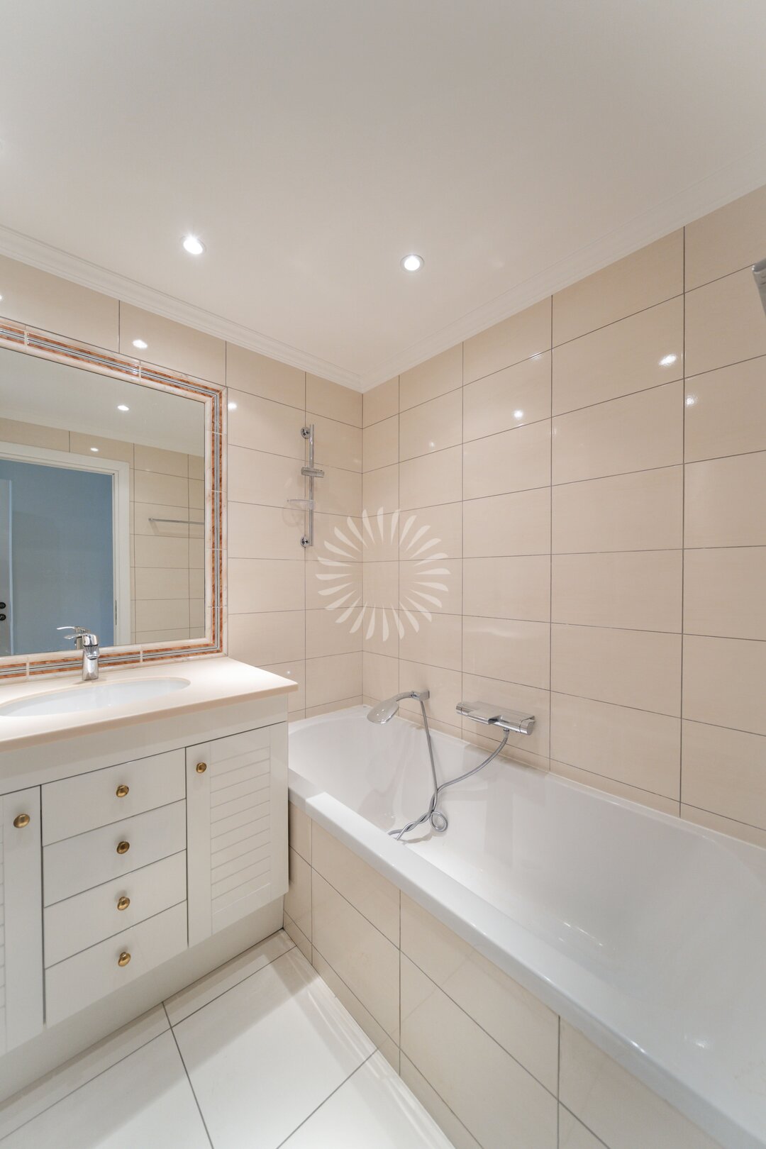 The property features a spacious and bright living room opening onto a large sea-view terrace, a fully equipped independent kitchen, and two en-suite bedrooms with private bathrooms and dressing rooms.