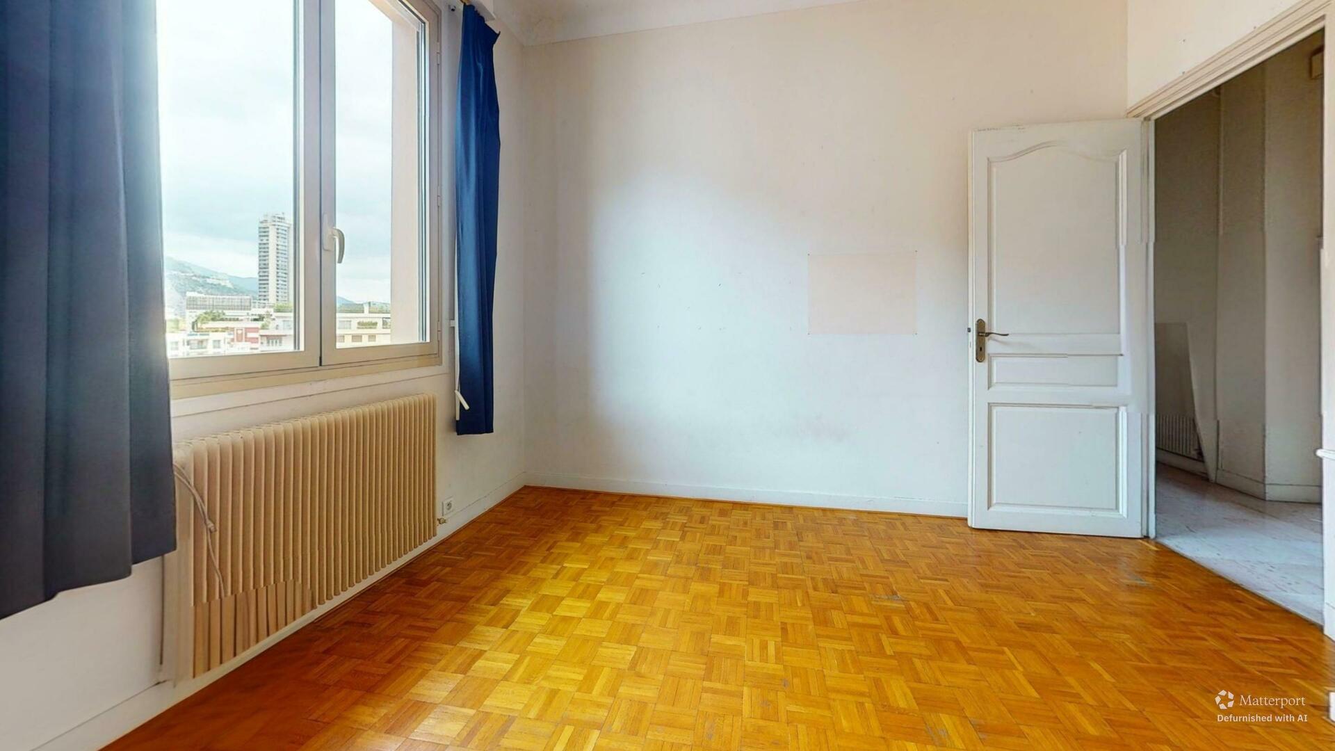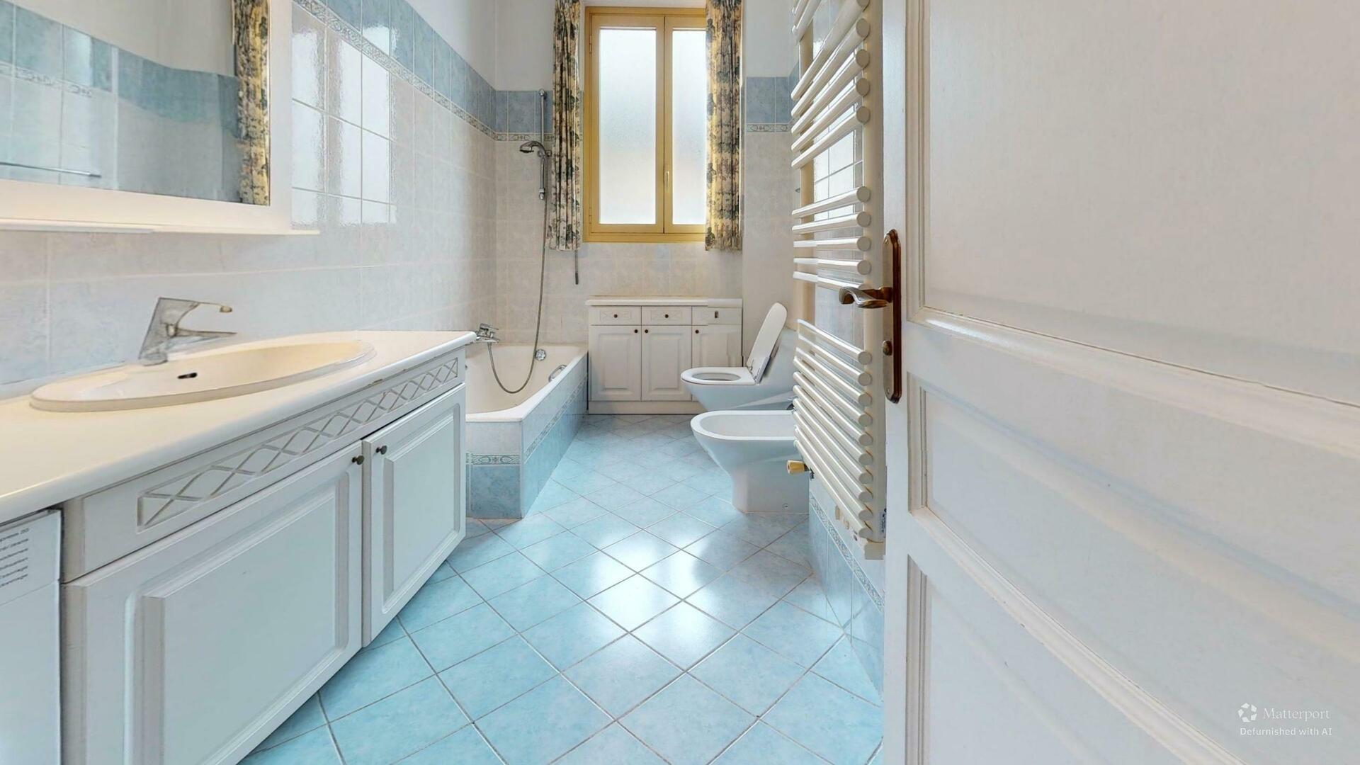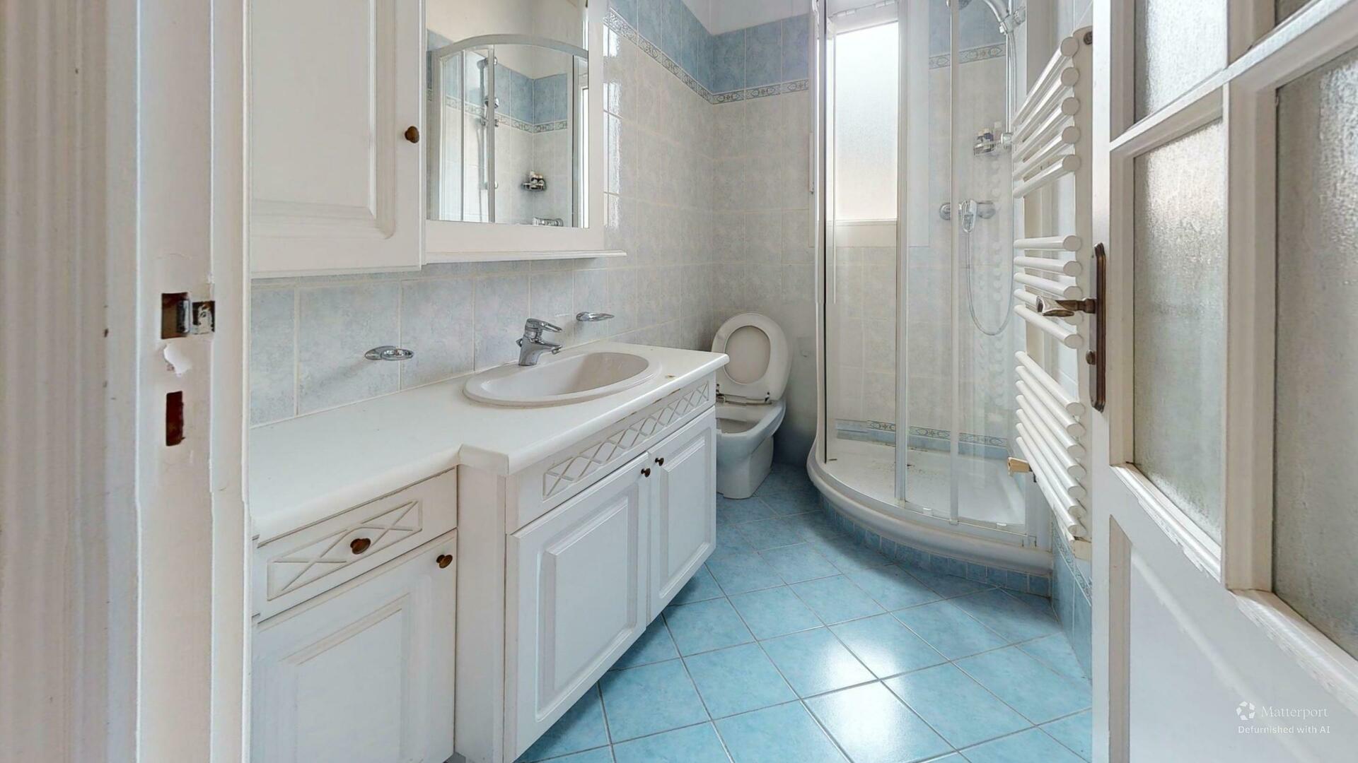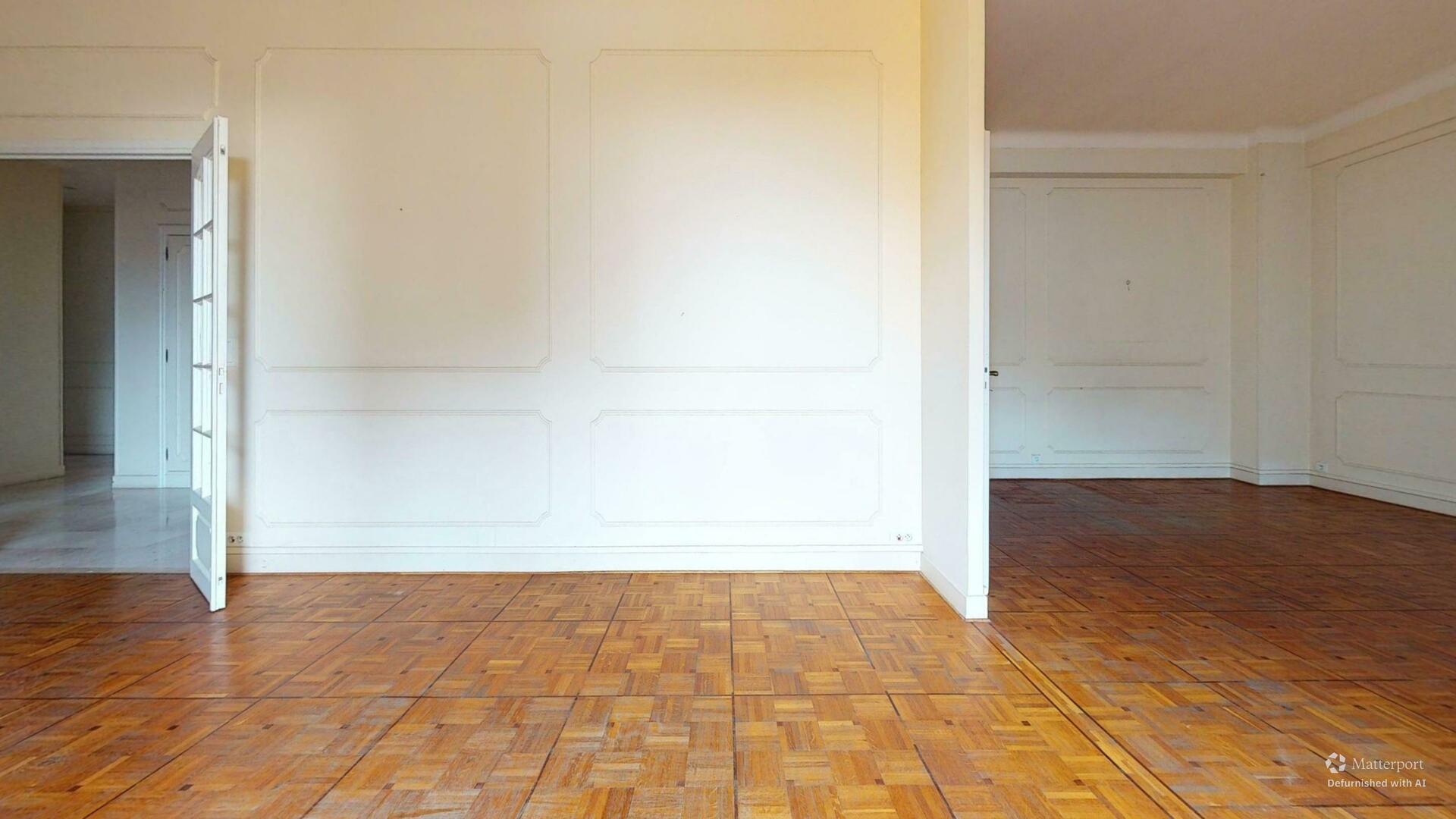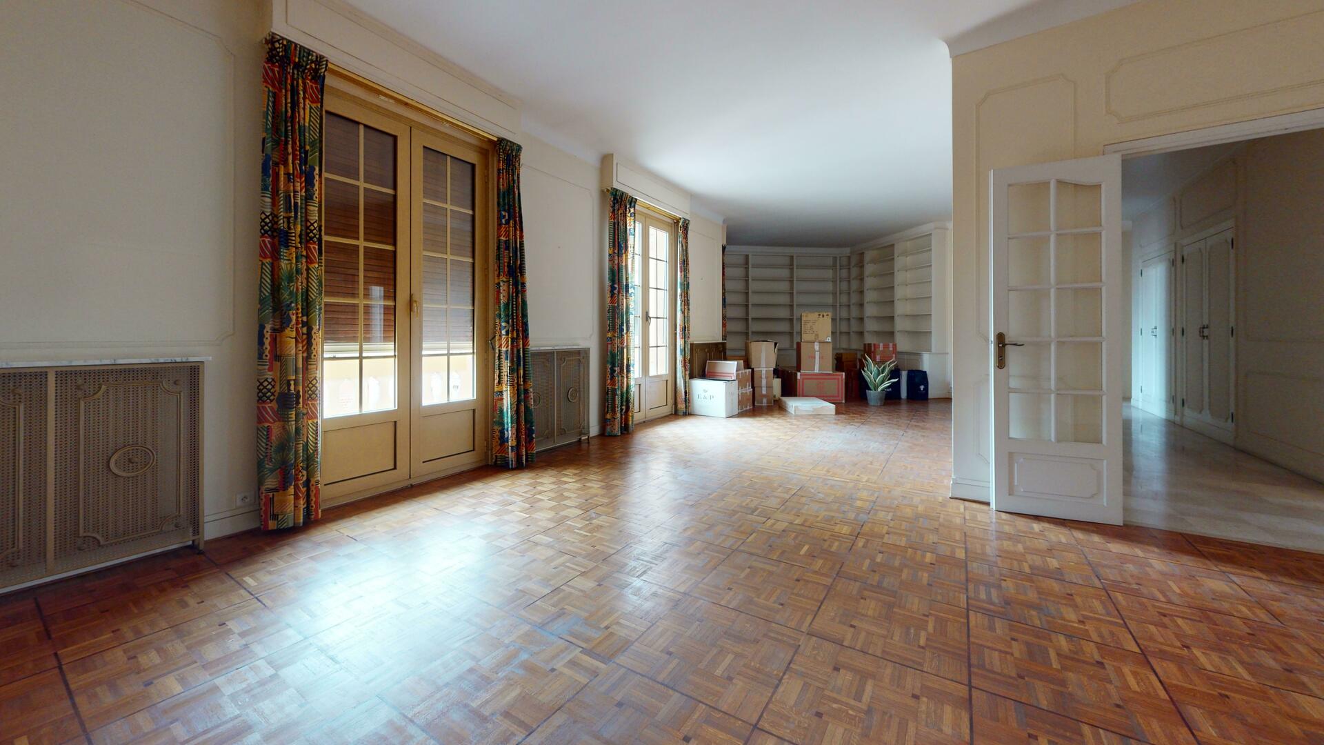 The apartment features an entrance hall with built-in storage, a double living room with a custom-made library, and a large independent fully equipped kitchen with natural light. The sleeping area comprises four bedrooms with integrated wardrobes, a bathroom with window, a shower room with toilet, and a guest toilet.