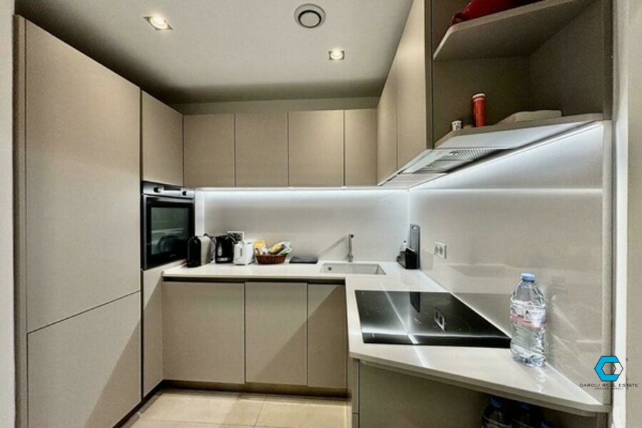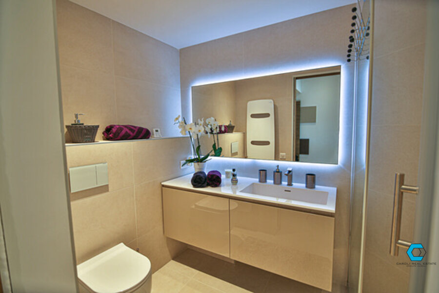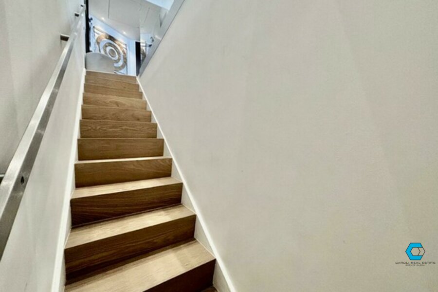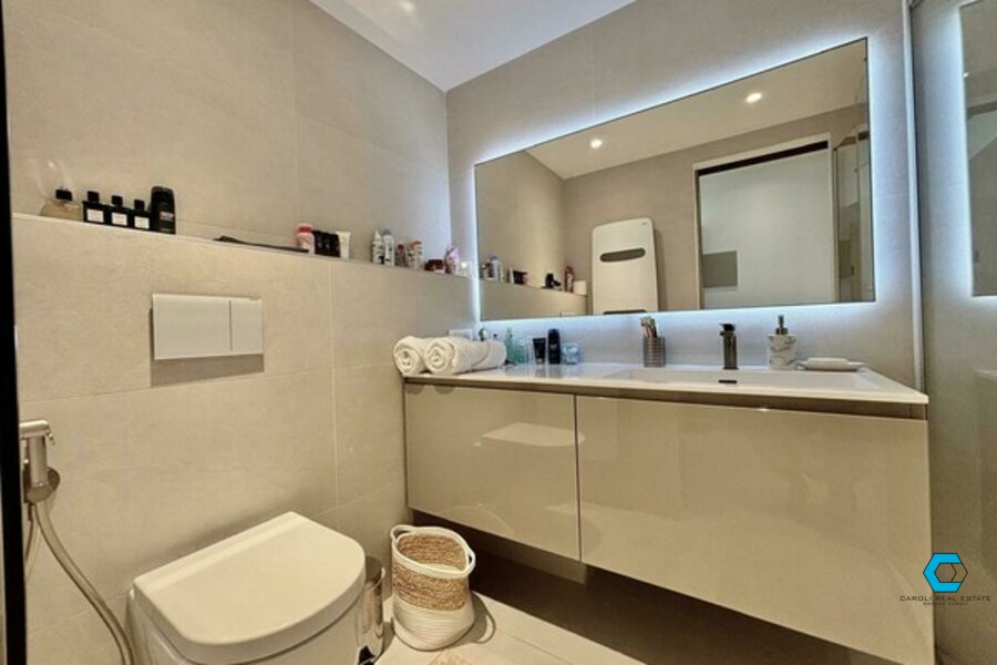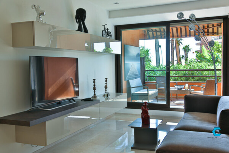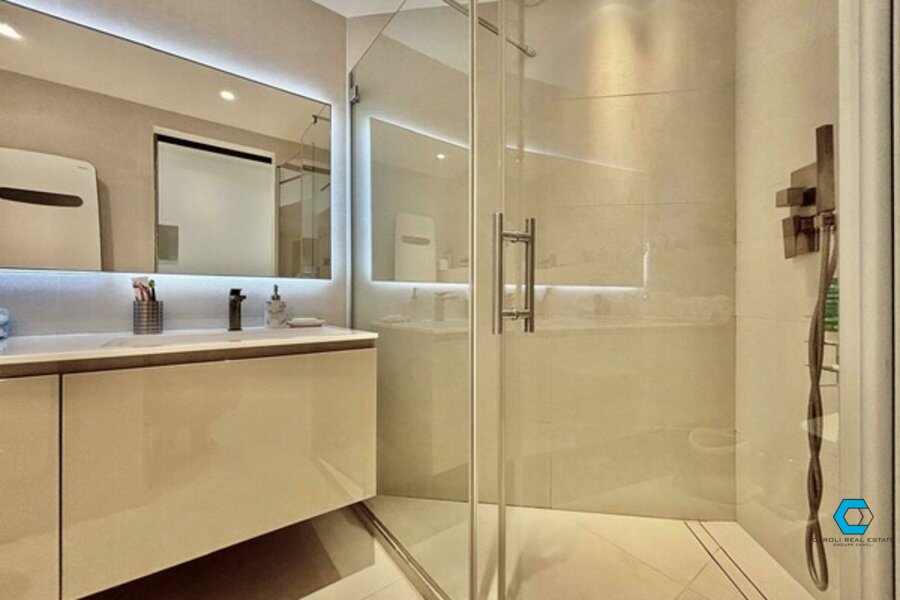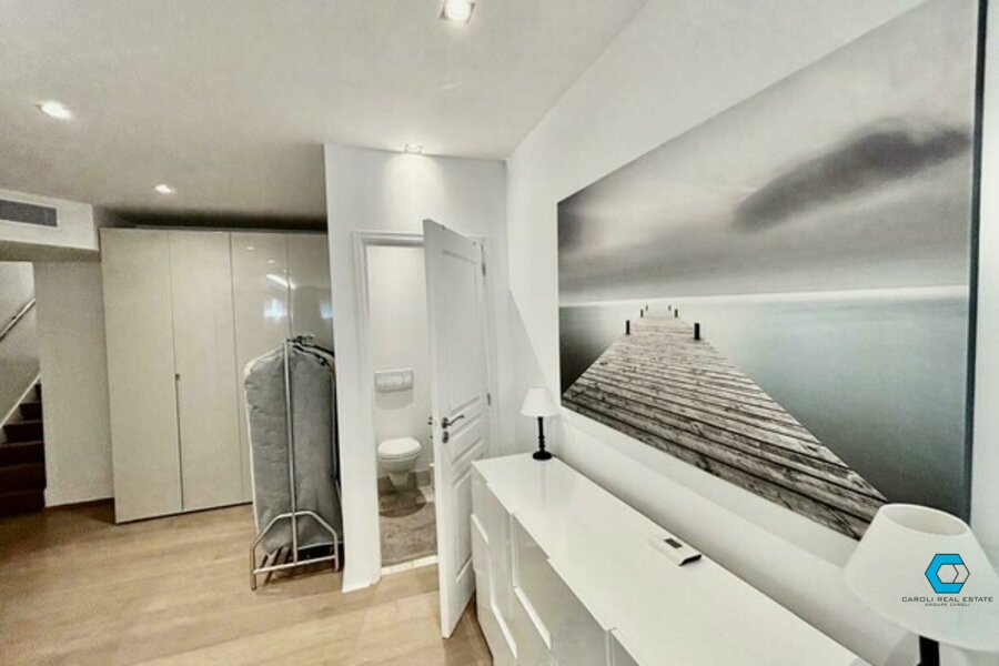 The duplex includes a bright living room, a modern kitchen, two bathrooms, a shower room, and a terrace with sea and pool views. On the lower level, you’ll find the bedroom with dressing room and private toilet.