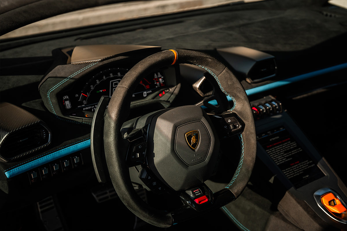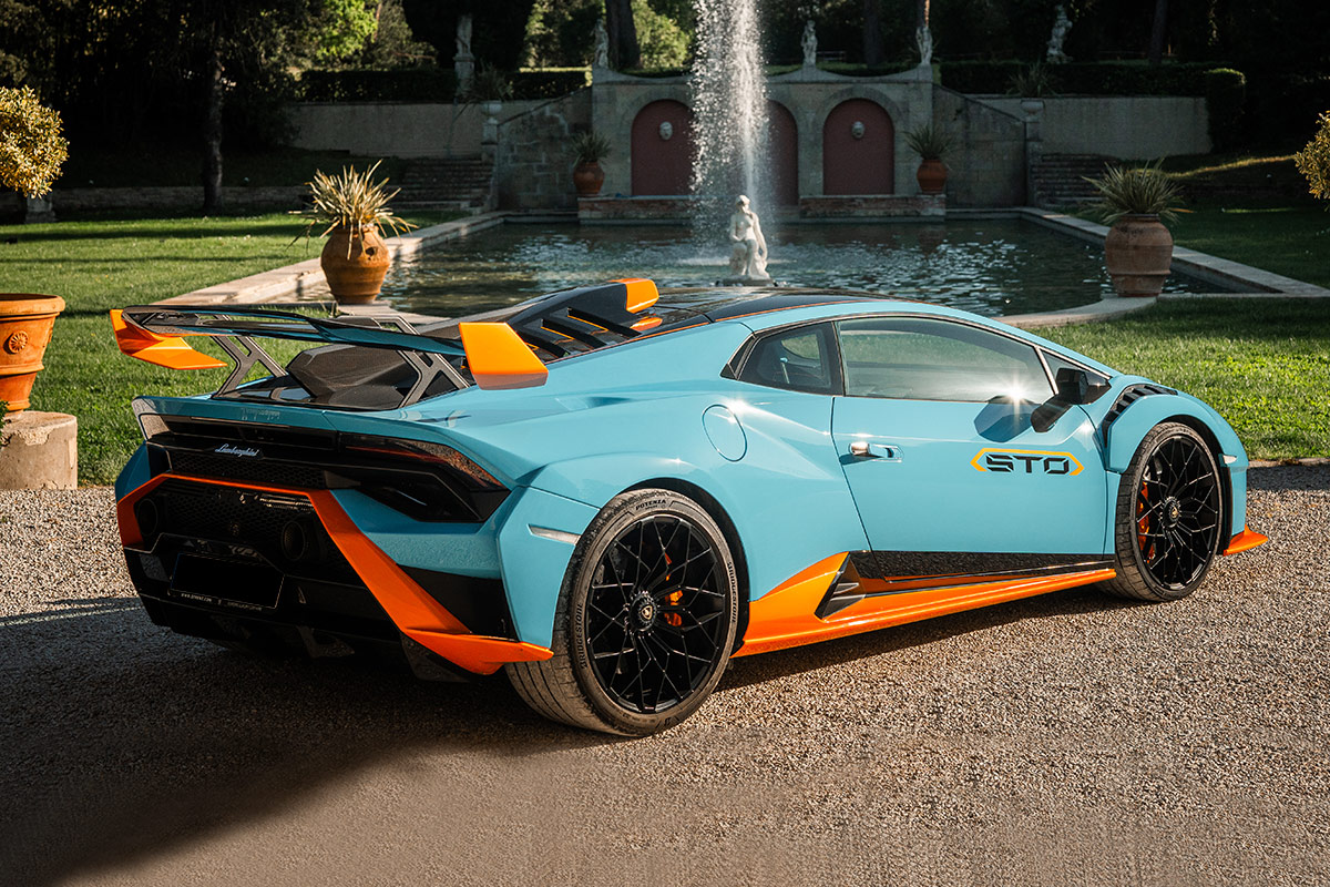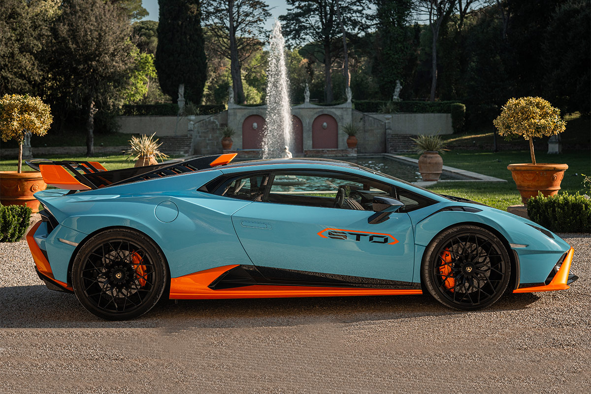 Crafted with 75% carbon fiber, the Huracán STO weighs just 1,339 kg, combining incredible agility with breathtaking power. Its signature Blu Cepheus and Arancio Xanto livery, racing seats in Alcantara and carbon, and single-nut wheels make it one of the most visually striking supercars ever built.