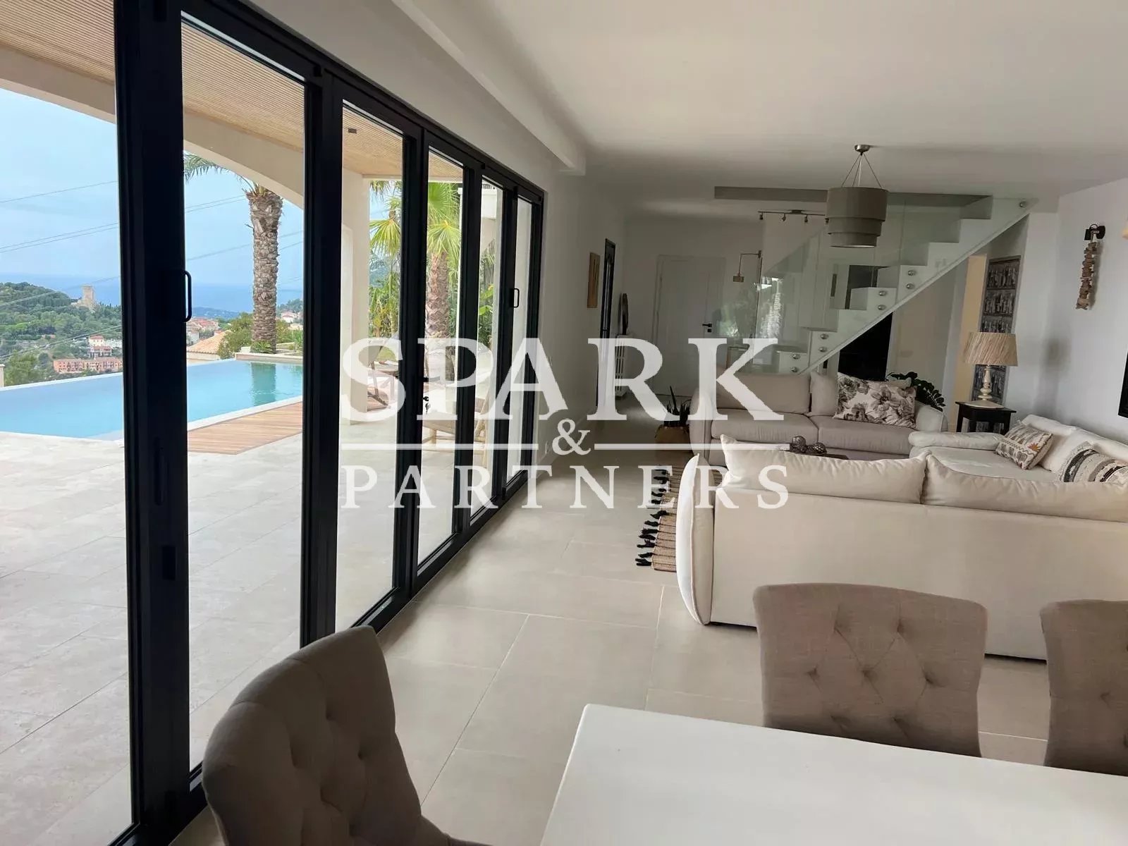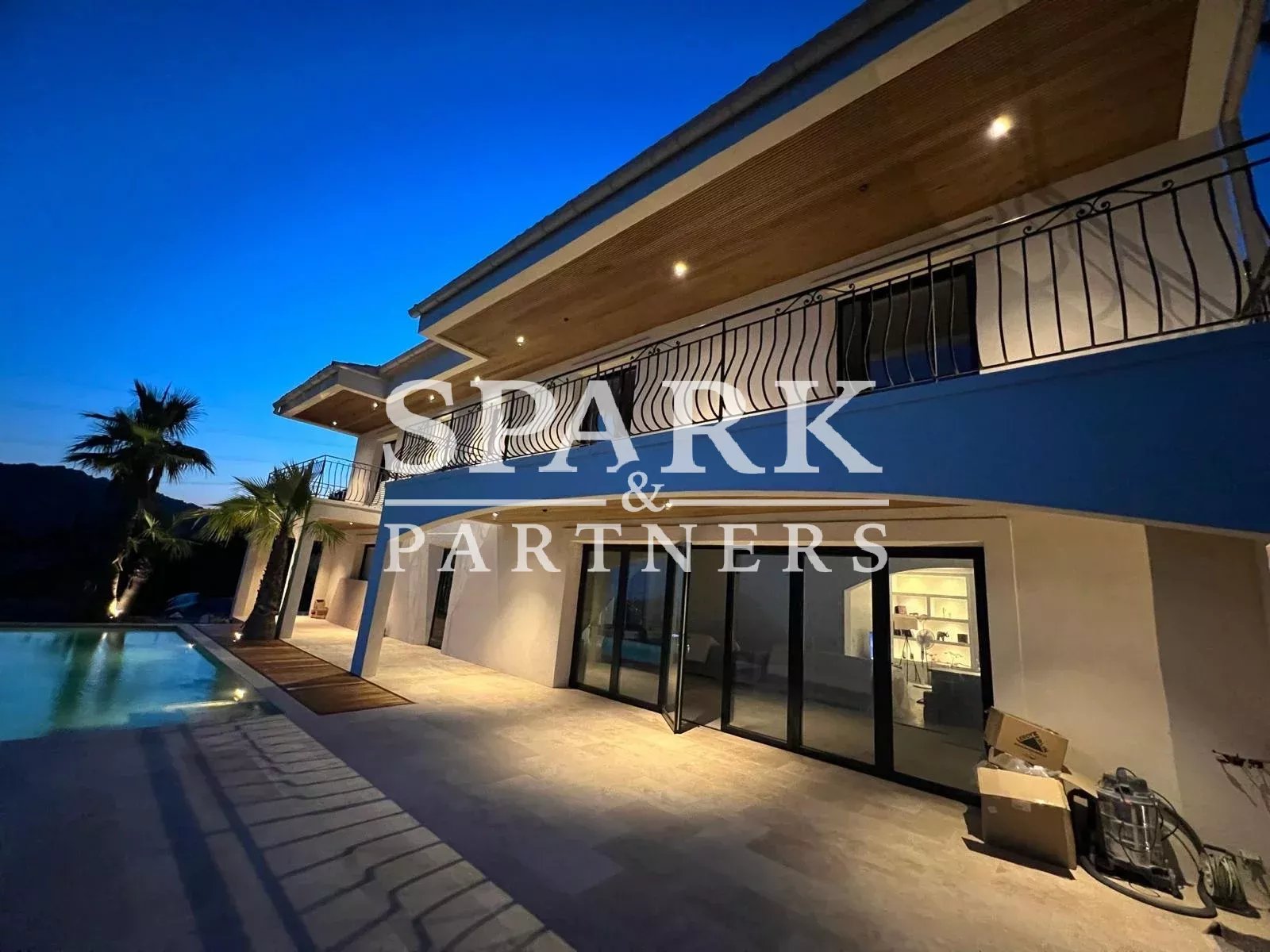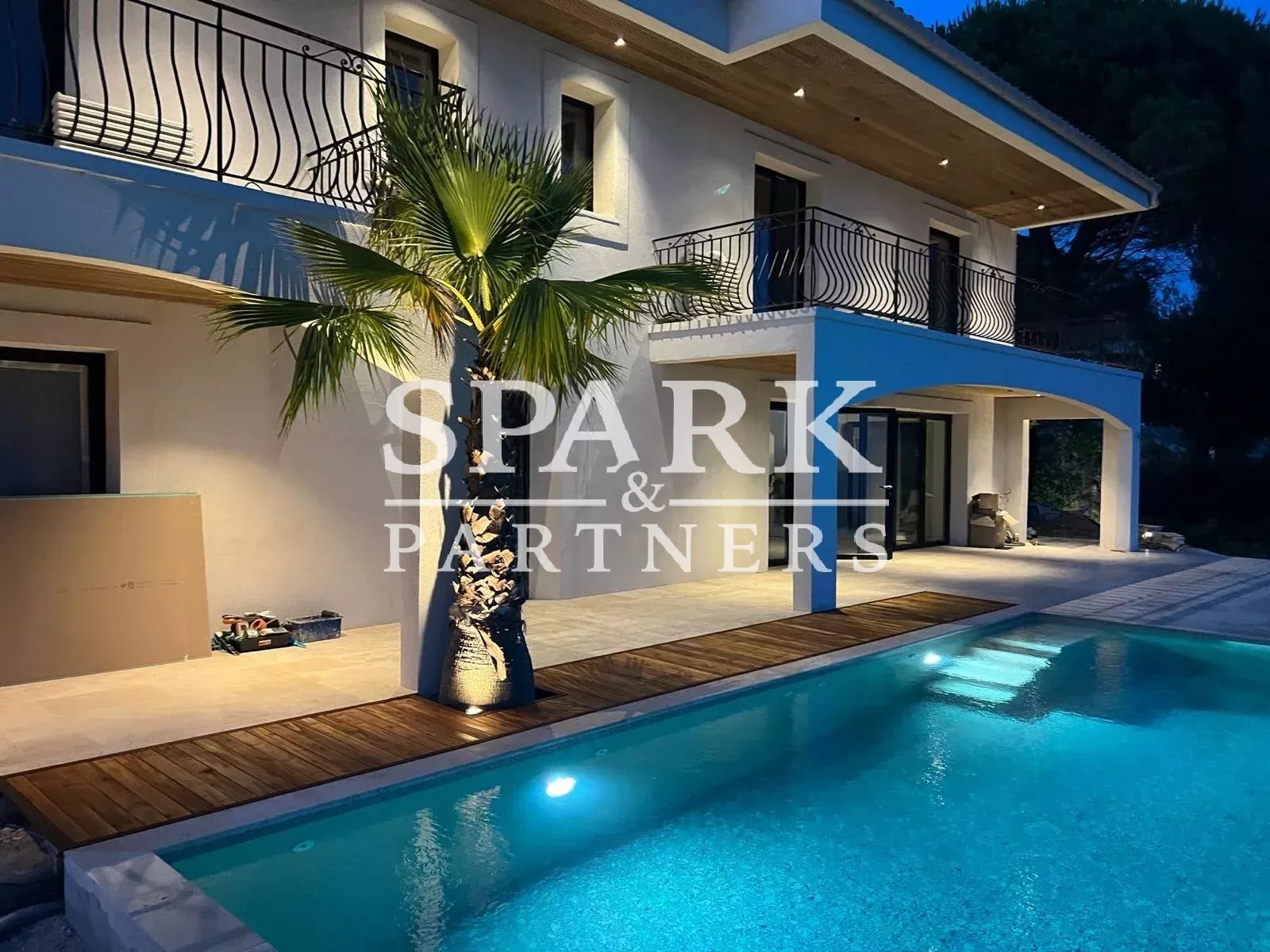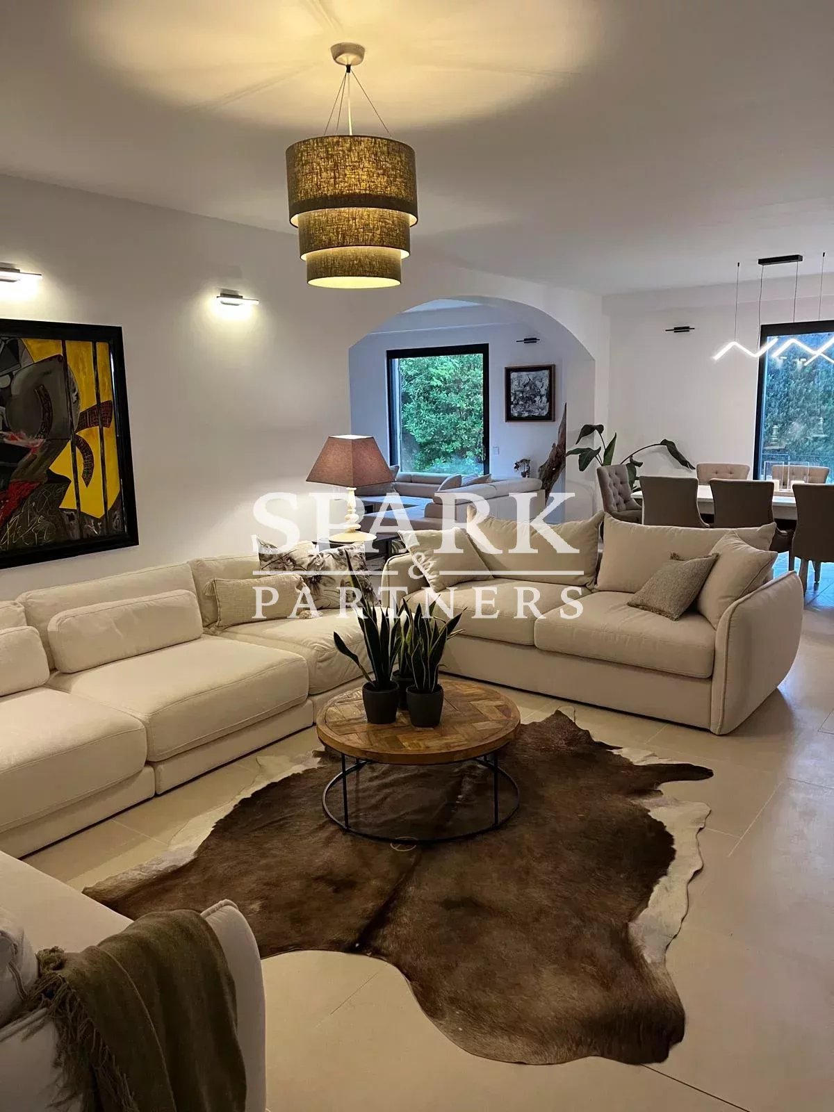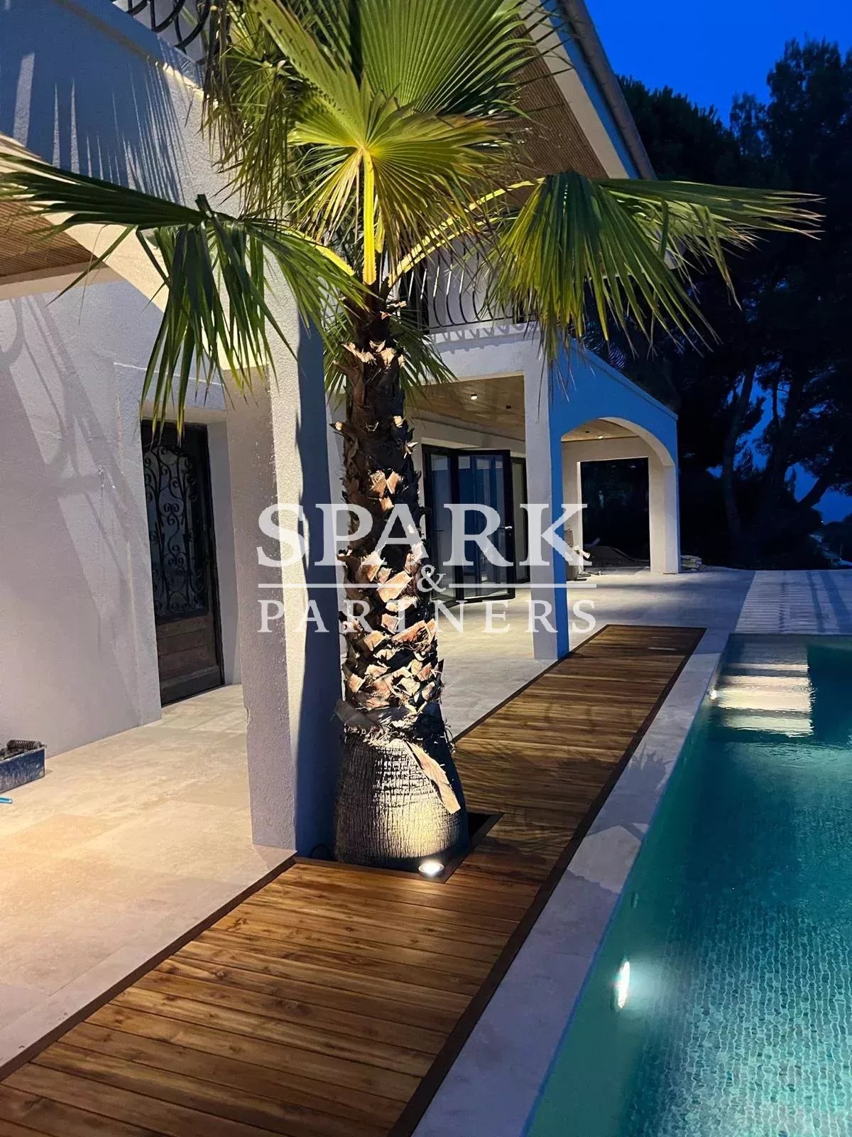 Renovated with exceptional materials, the villa features a vast living and dining room, a large modern kitchen with a dining island, and six bedrooms, each with its own private bathroom. Four of these rooms open onto a terrace furnished with outdoor furniture for relaxing moments in total privacy.