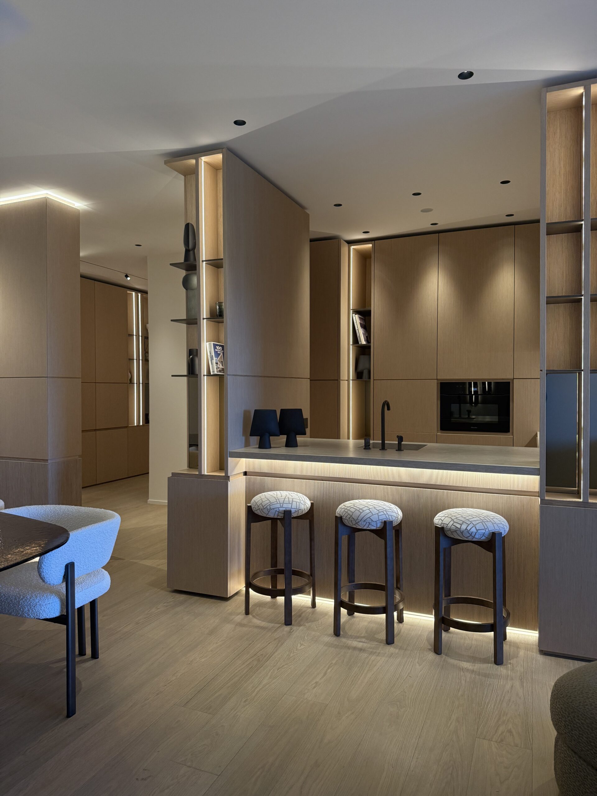 The property features a spacious and bright living room with floor-to-ceiling windows, two beautifully appointed bedrooms, a fully equipped independent kitchen, ample storage, and two elegant bathrooms.