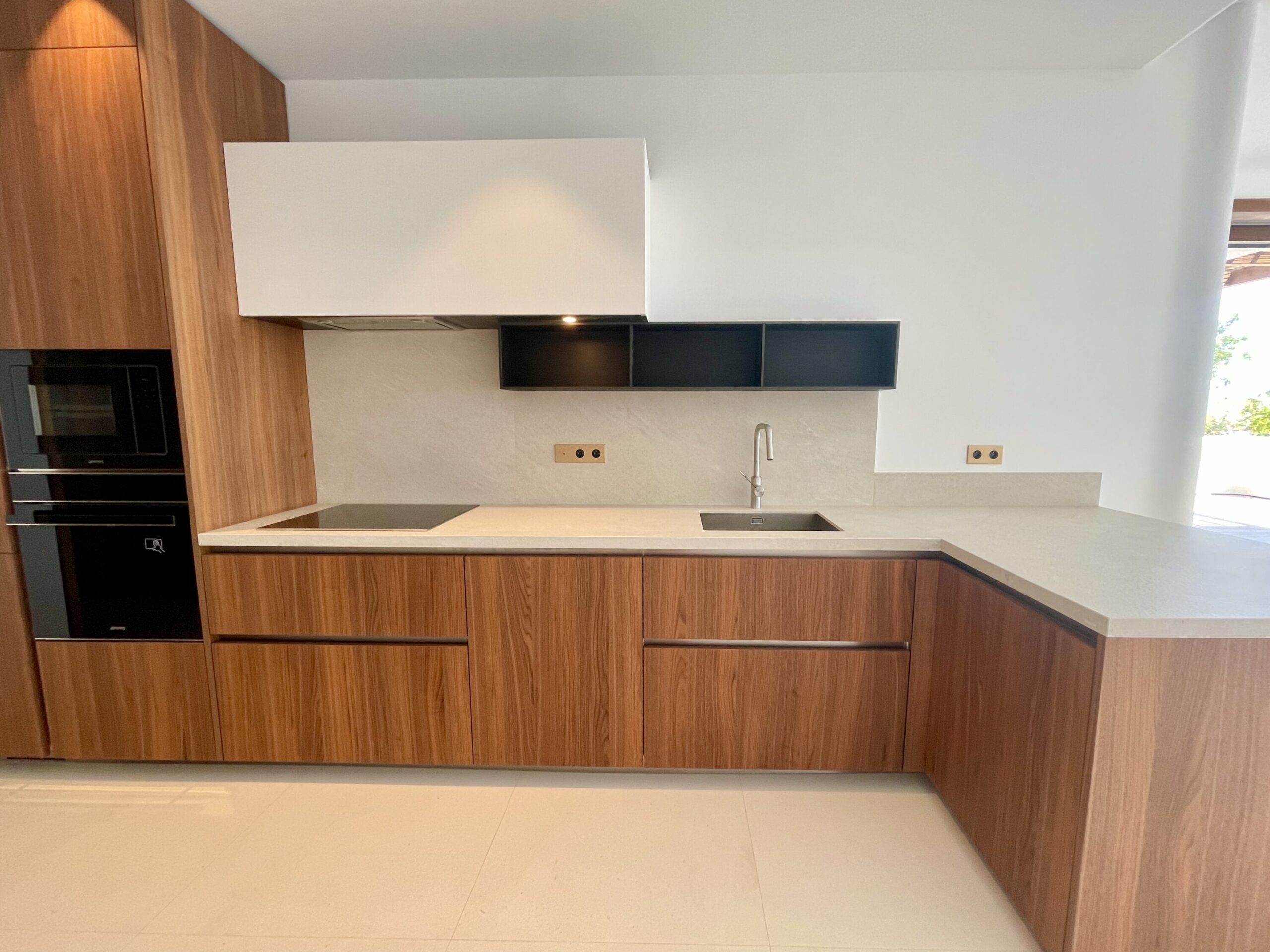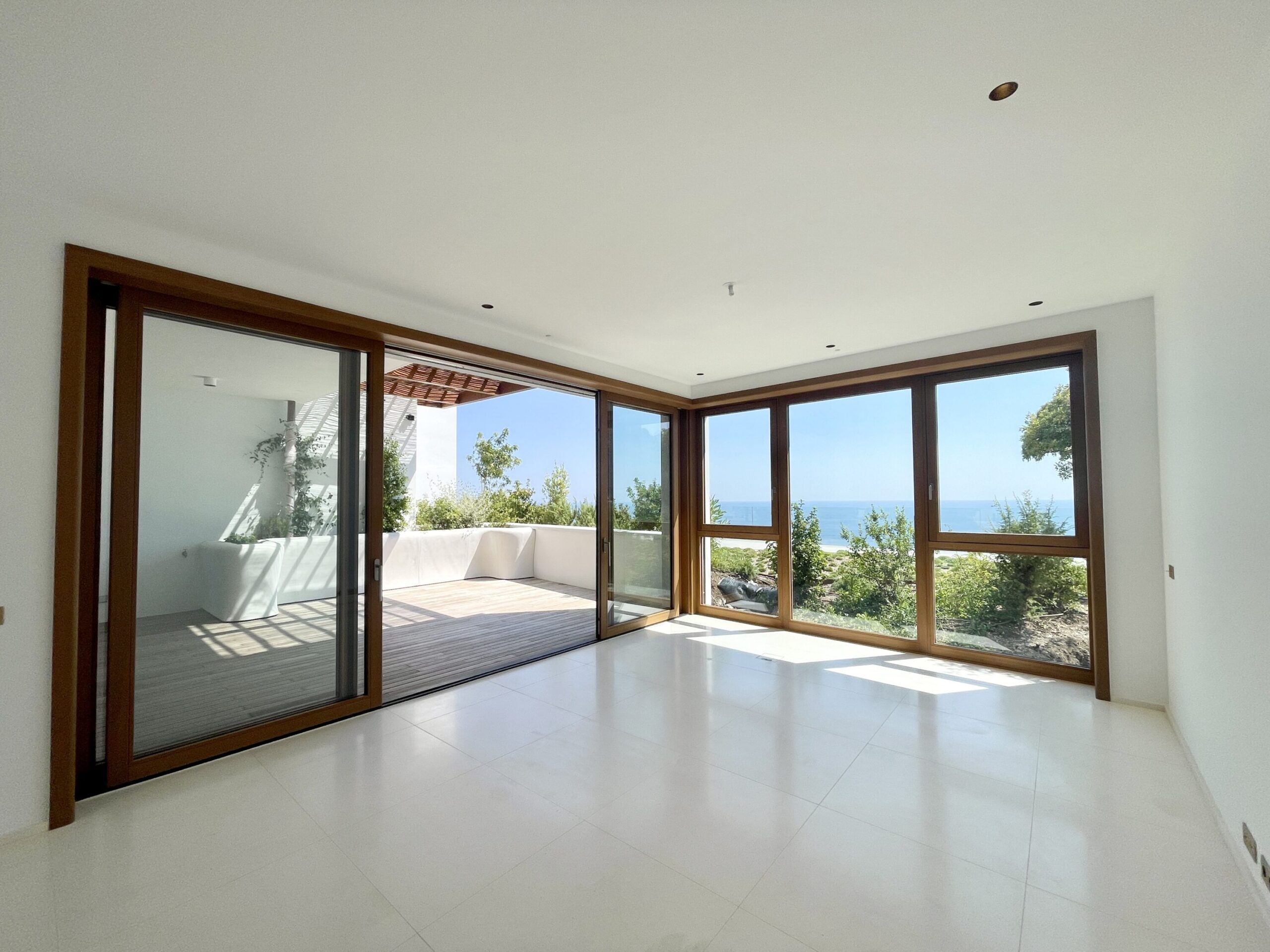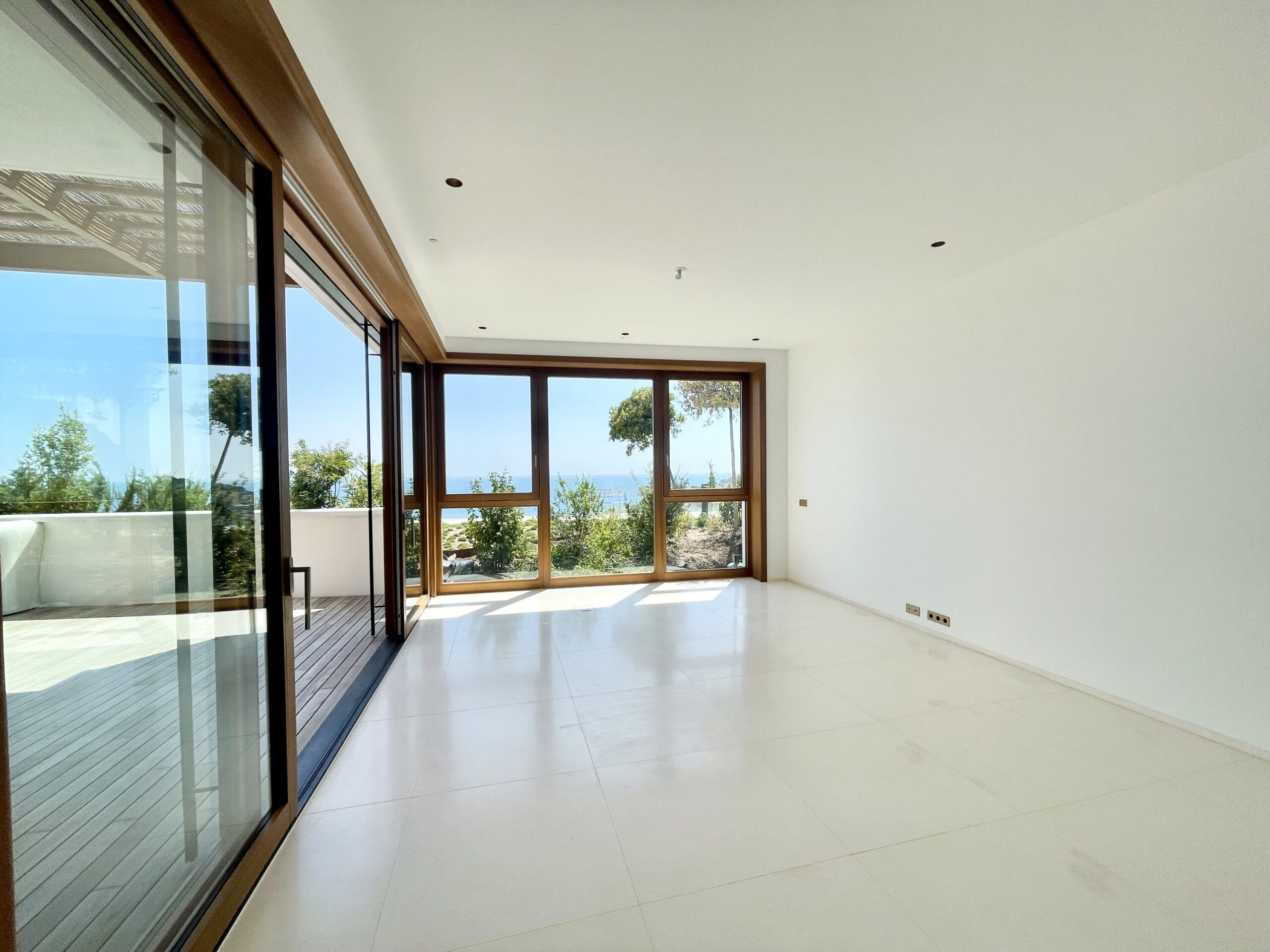 The property features an entrance hall opening onto a spacious living room with a sea-facing terrace, a fully equipped open-plan kitchen, utility/storage room, guest toilet, and two elegant en-suite bedrooms with balconies and dressing rooms.