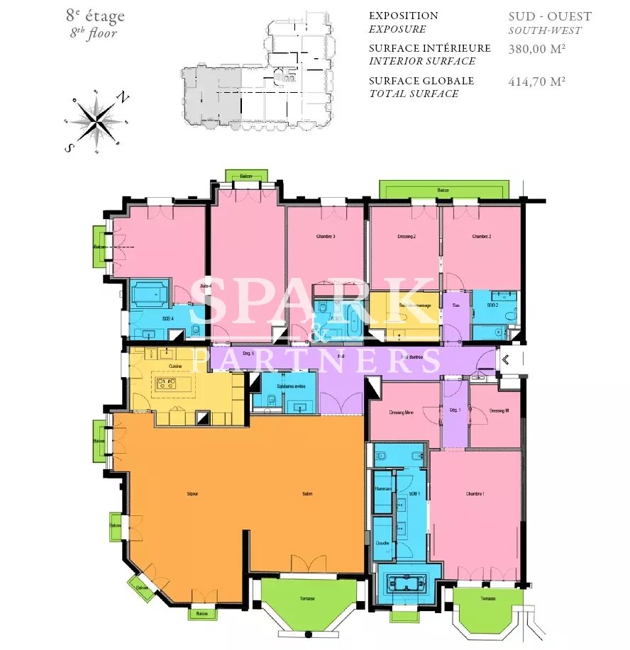 Offering 380 m² of living space, it also benefits from numerous terraces/balconies. It comprises an entrance hall, a vast lounge, a living room, a separate kitchen, four bedrooms with en suite bathrooms, a hallway, a guest toilet and a hammam.