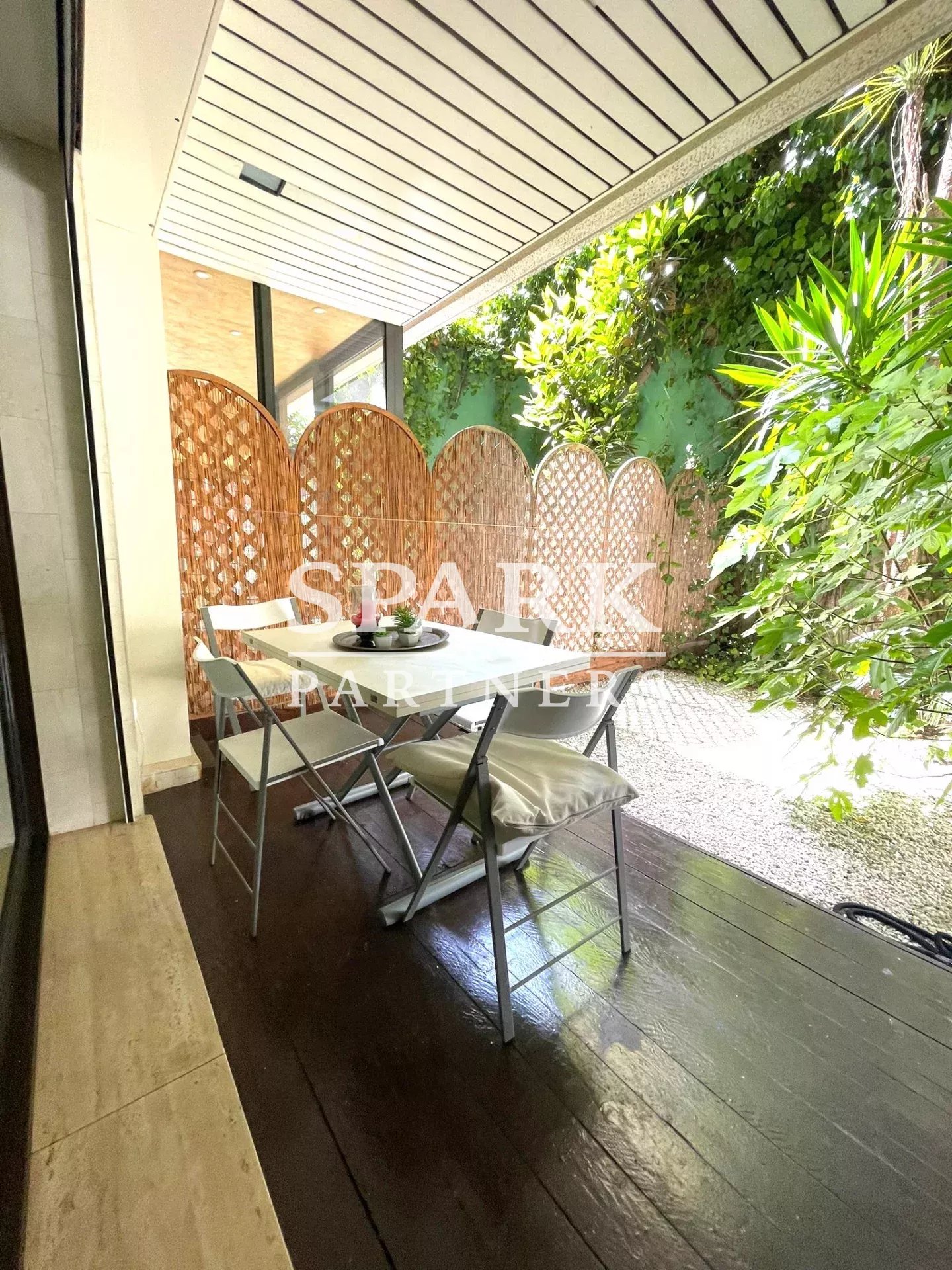 It comprises an entrance hall, a living room with open kitchen opening onto a pleasant terrace and adjoining garden, a bathroom, storage cupboards and a cellar.