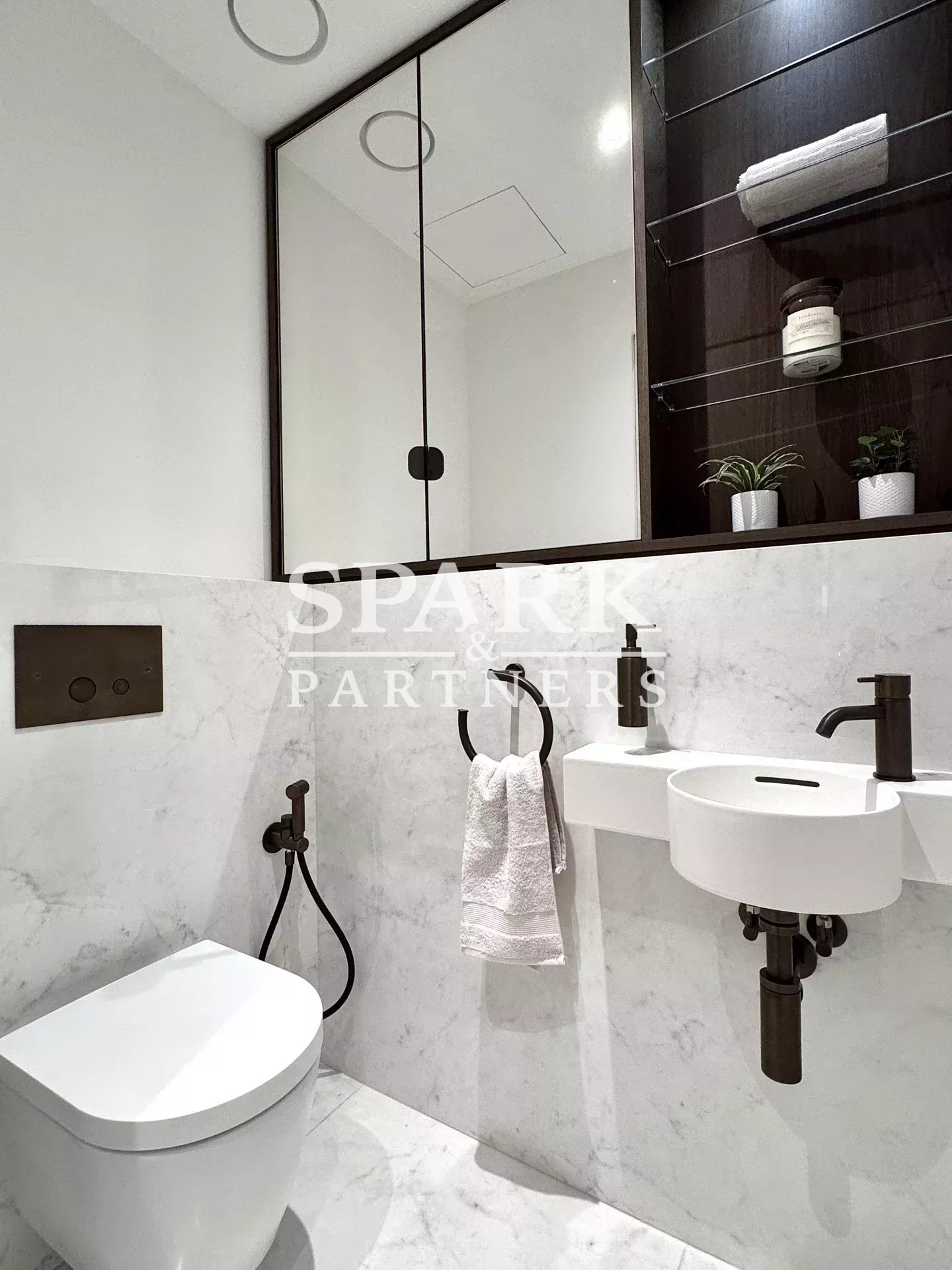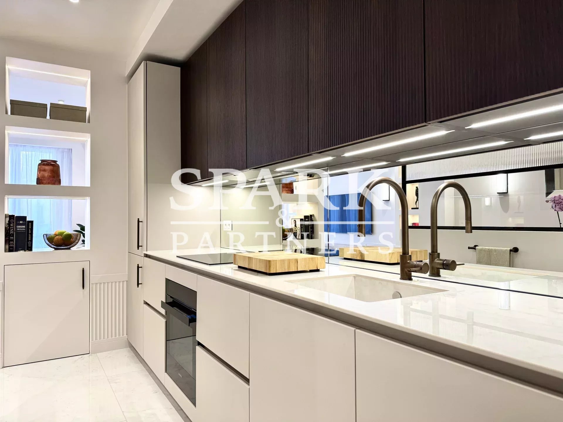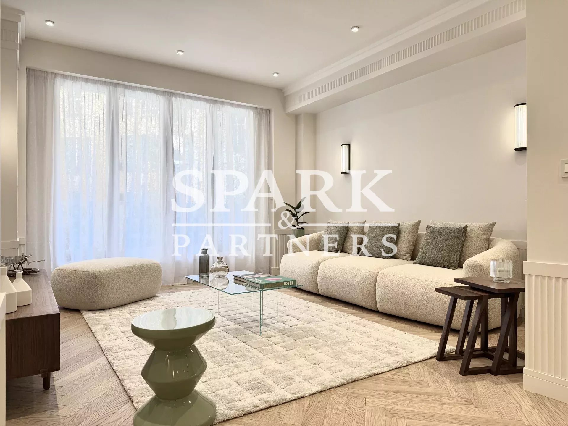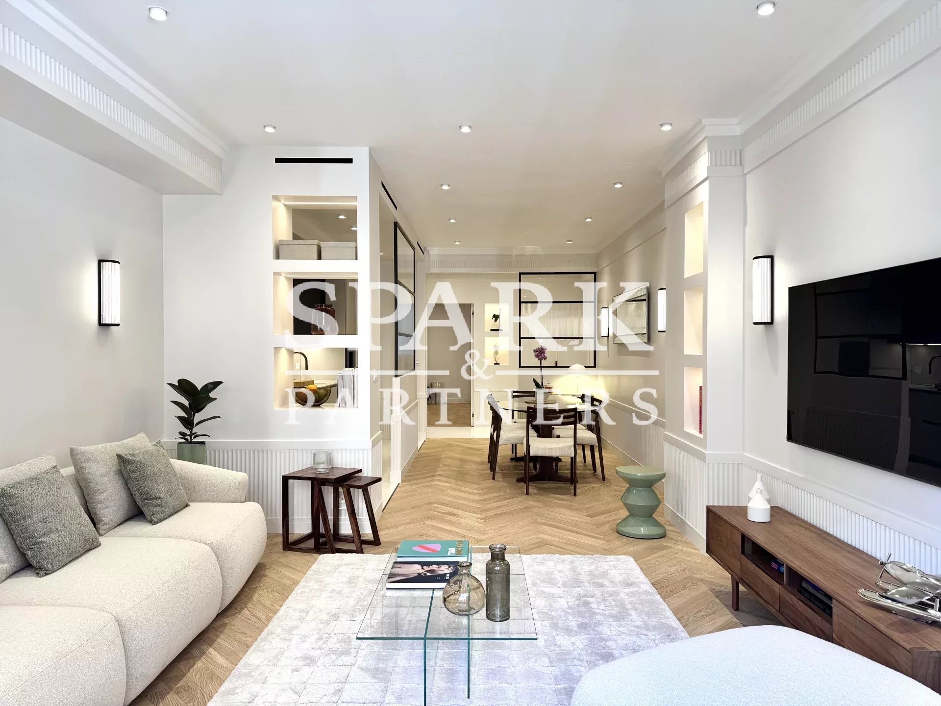 With a surface area of approximately 132 m², this bright property has been entirely renovated in a contemporary and refined style. It comprises an elegant entrance hall, a spacious living room opening onto a balcony, a dining room with a fully-equipped open kitchen, and a sumptuous master bedroom with en suite bathroom. Two further bedrooms, each with its own shower room, complete the night space, as does a guest toilet.