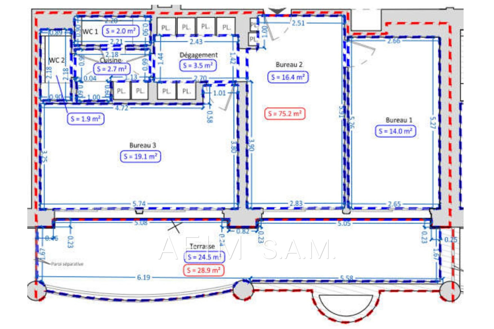 Dans le Carré d’Or, BEAU BUREAU en étage, bénéficiant d’un bel ensoleillement, exposé au Sud, dans un immeuble de standing, avec conciergerie 24h/24, composé de 3 espaces séparés, bordés par une terrasse commune de 28.9 m².