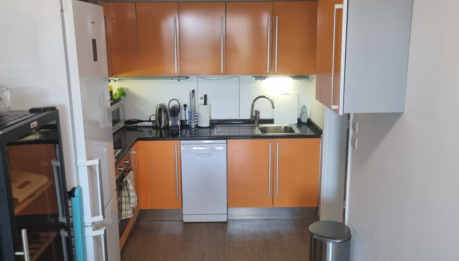 The apartment features an entrance hall, a bright living room opening onto the terrace, a comfortable bedroom, a fully equipped kitchen, and a complete bathroom. A cellar and a large double-length parking space complement this rental.