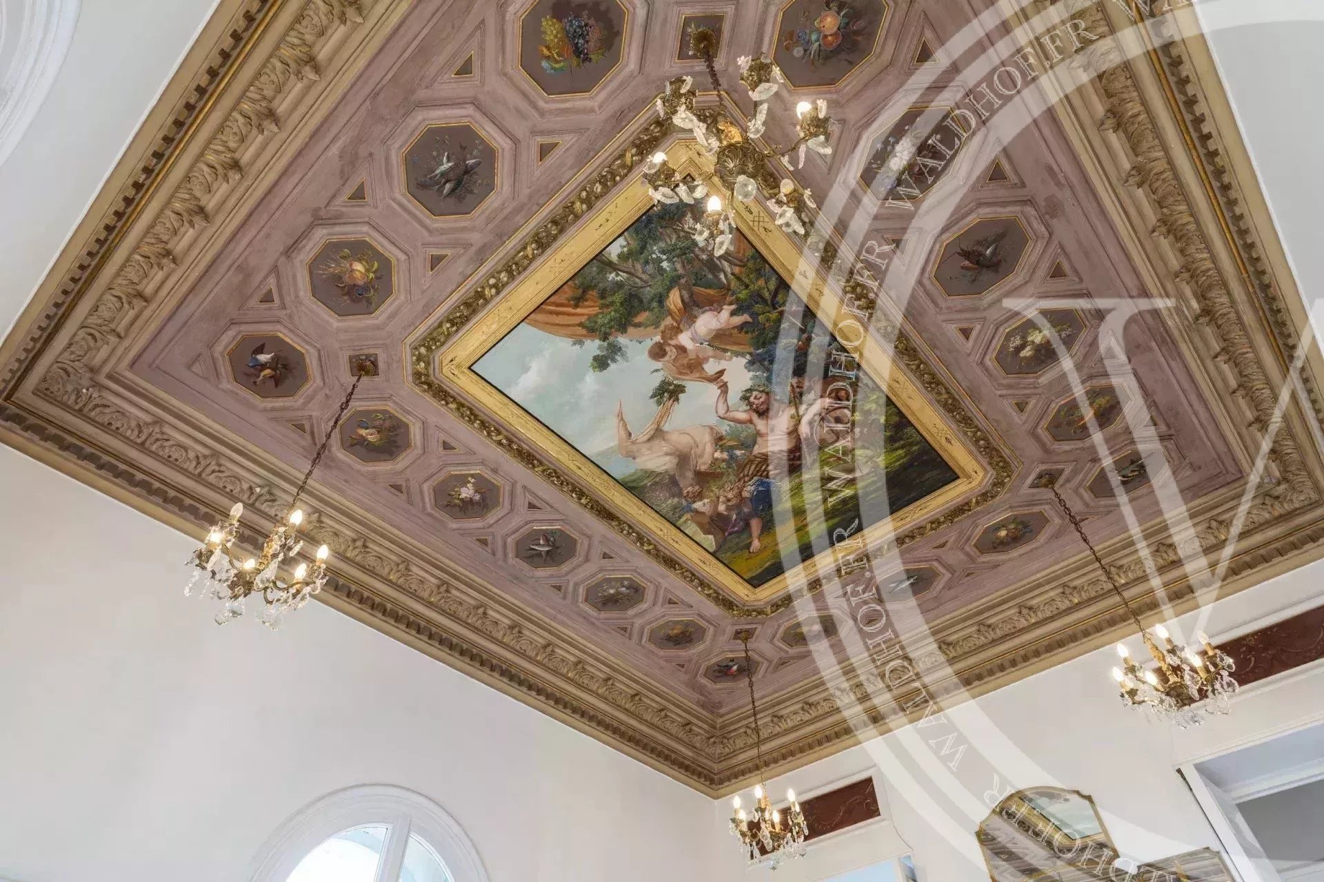 The ceilings are especially remarkable—currently undergoing classification—with painted depictions of Bacchus, ornate stucco, and pictorial elements like foliage, cherubs, and feminine figures set against gold backgrounds in the style of the Second Empire. The monumental staircase, decorated by artist V. Colleoni, features painted soffits and canvases illustrating mythological and pastoral scenes.